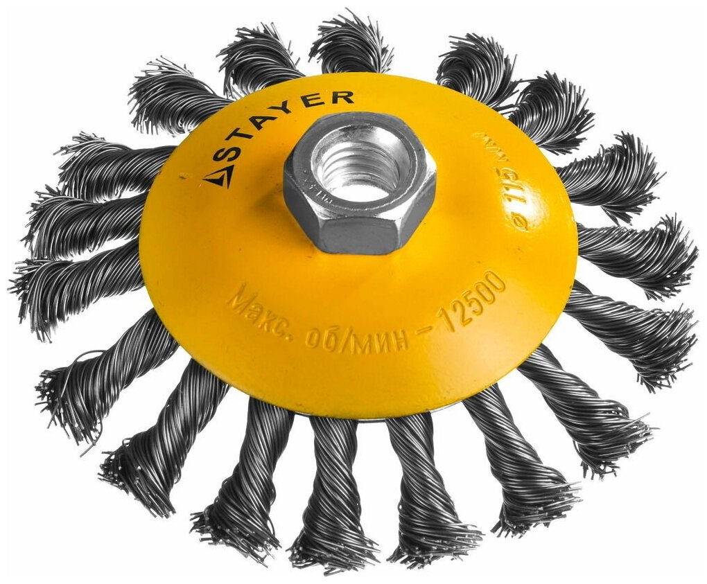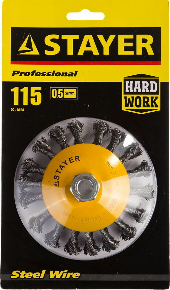 Щетка коническая Stayer 35135-115 используется в угловых шлифмашинах при зачистке поверхностей от лакокрасочных покрытий, ржавчины, окалины, различных загрязнений, а также при зачистке сварных швов.