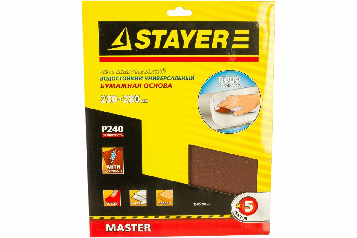 STAYER 230 х 280 мм, Р240, 5 шт, универсальный, на бумажной основе, водостойкий, лист шлифовальный (35425-240_z01)Модель - 35425-240_z01Технические характеристики:-Абразивный материал: Оксид алюминия -Толщина листа: 0,4 мм-Антистатическое покрытие абразива: есть -Тип нанесения абразива: Электростатический -Количество в упаковке: 5 листов -Применение: по дереву, металлу и пластику -Тип связки абразива: бакелитоваяОсновными достоинствами шлифовальных кругов Stayer являются их высокая эффективность, повышенный рабочий ресурс и универсальность использования при обработке различных отделочных материалов. Шлифовальная шкурка обладает низким показателем забиваемости. Повышенной гибкостью и эластичностью. Возможностью использования для "мокрого" шлифования. Разрезание листа на отрезки необходимого размера позволяет использовать шлифшкурку на электроинструменте с зажимом.Преимущества:Шлифовальная шкурка обладает низким показателем забиваемости. Повышенной гибкостью и эластичностью. Возможностью использования для "мокрого" шлифования. Разрезание листа на отрезки необходимого размера позволяет использовать шлифшкурку на электроинструменте с зажимом.