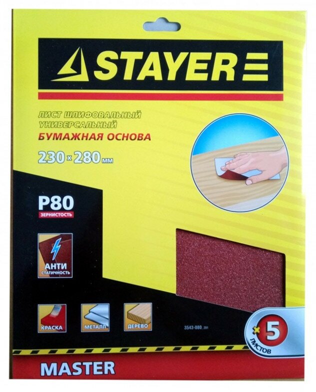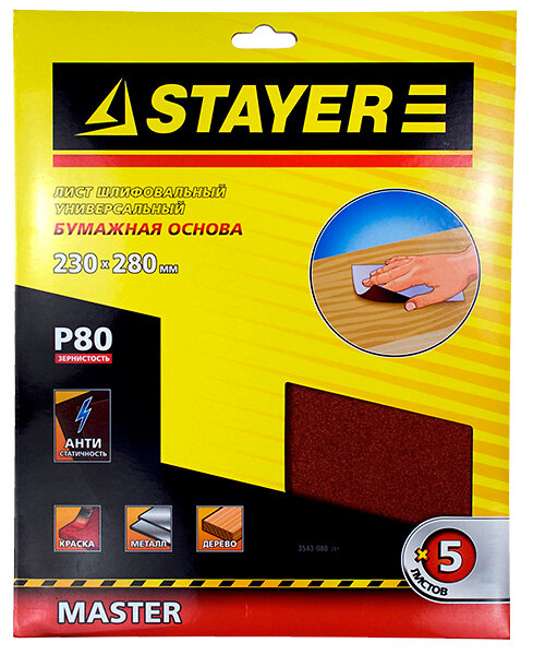 Лист шлифовальный Stayer 3543-080_z01 230 х 280 мм, HSS-R, быстрорежущая сталь М2(S6-5-2) Р6М5, класс А Р80, 5шт., универсальный, на бумажной основе