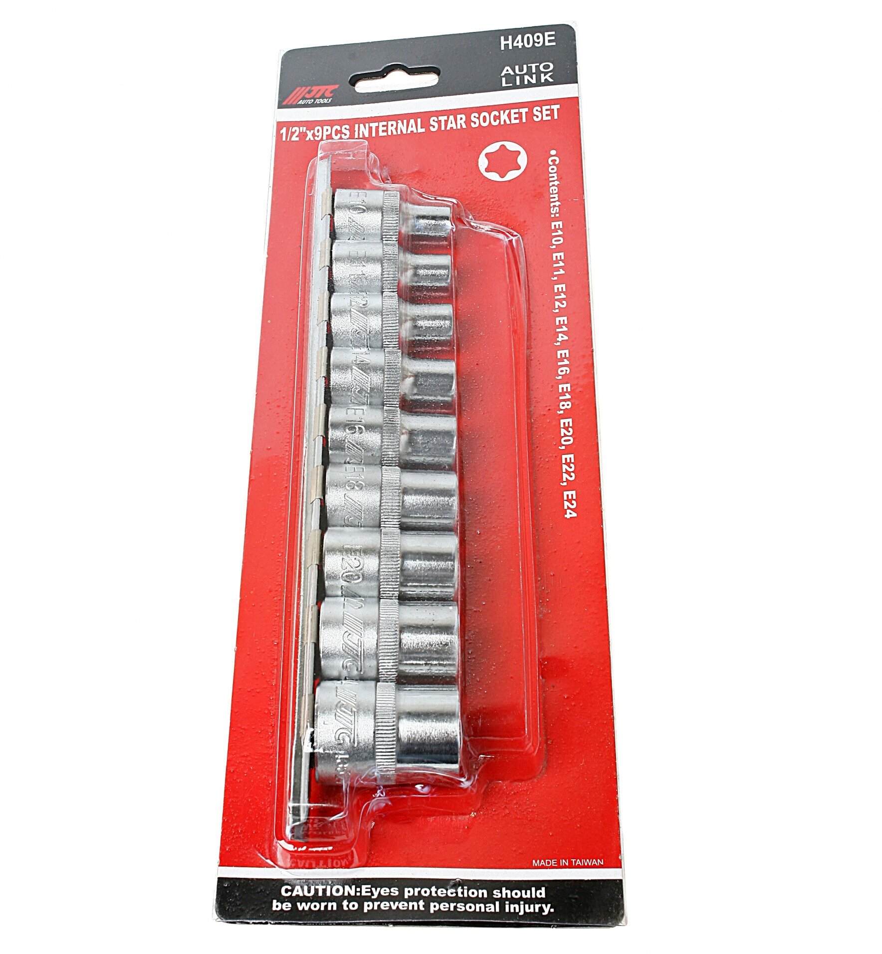Набор торцевых головок TORX (1/2", E10-E24) 9 предметов JTC используется для работ с болтами, имеющими рабочий профиль EXTERNAL TORX (Е). Головки различаются по диаметру и хвостовику. Обладают лучшим крутящим моментом по отношению к резьбе, чем другой подобный инструмент. Набор поставляется на специальной планке, которая обеспечивает удобное хранение головок. Габаритные размеры: 330х110х30 мм.