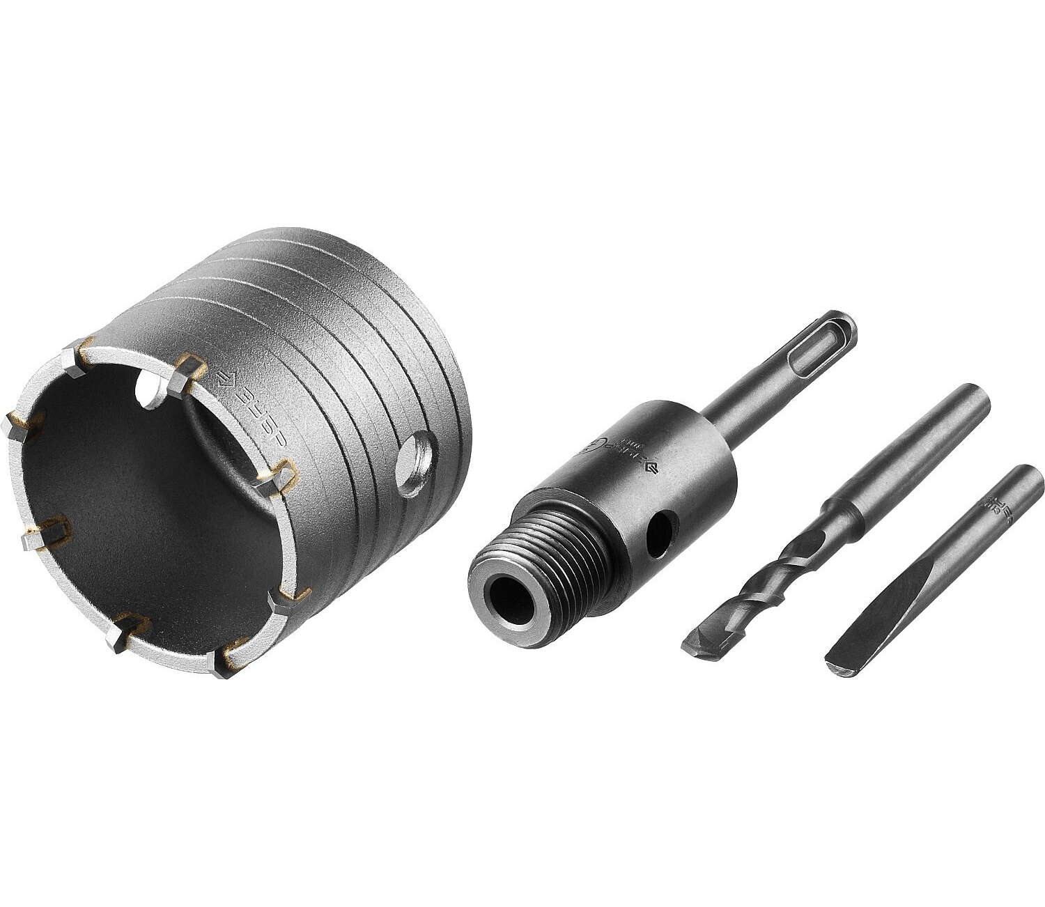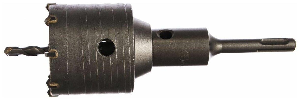 Изготовлена из высококачественной углеродистой стали. Оснащена твердосплавными резцами марки BK85. Центрирующее сверло с твердосплавным наконечником и коническим хвостовиком. Конусное соединение (державки и сверла) надежно фиксирует центрирующее сверло, облегчает сборку и демонтаж инструмента. Хвостовик: SDS-Plus.