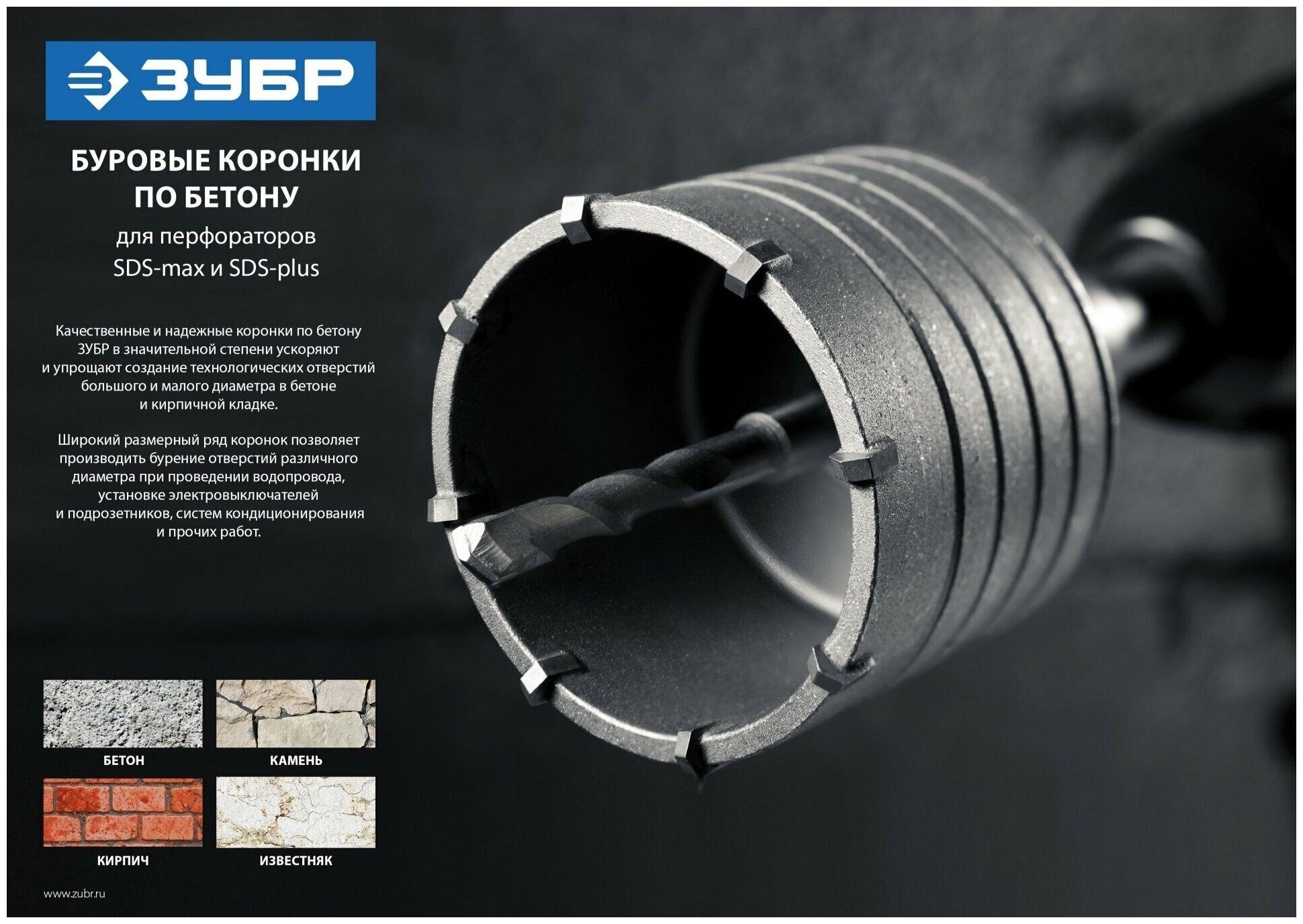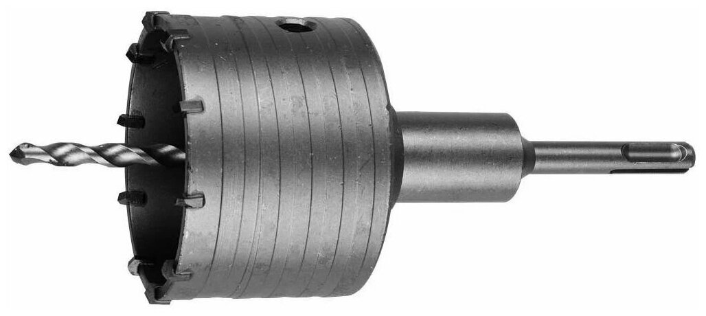 Буровая коронка ЗУБР с хвостовиком SDS Plus ( 2918-**_z01 ) Предназначена для просверливания отверстий большого диаметра в керамической облицовочной плитке, кирпиче, гипсовых плитах. Коронка имеет шесть твердосплавных резцов. В комплект входит державка с хвостовиком SDS Plus и центровочным сверлом с твердосплавной пластиной. При работе с перфоратором можно использовать функцию «сверление с ударом».