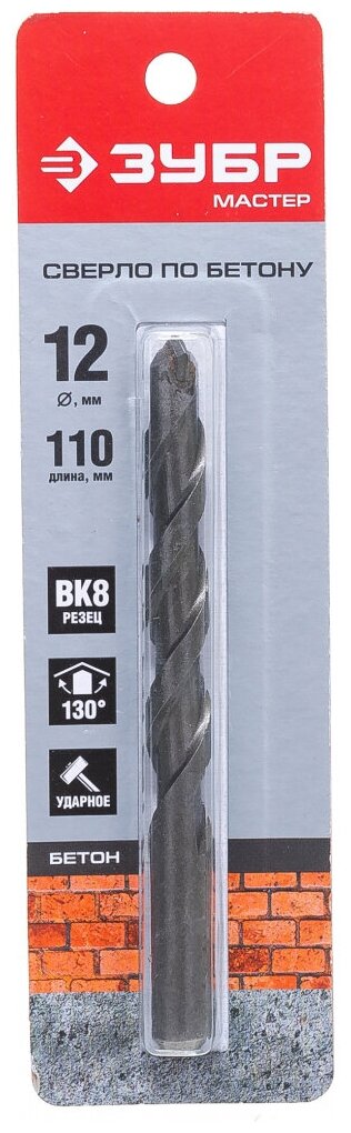 Сверло по бетону ударное ЗУБР ( 2922-***-** ) Предназначены для ударно-вращательного сверления бетона, кирпича, камня, плотных известняков. Твердосплавная пластина (ВК8) П-образная спираль Угол заточки при вершине 130° Цилиндрический хвостовик Сверла по бетону ЗУБР серии мастер – Ваш надежный и проверенный инструмент в быту и строительстве. Применяются для работ по бетону, граниту, природному и искусственному камню, кирпичной кладке.