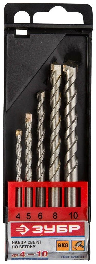 | Размер сверл в наборе, мм | 4, 5, 6; 8, 10 мм |