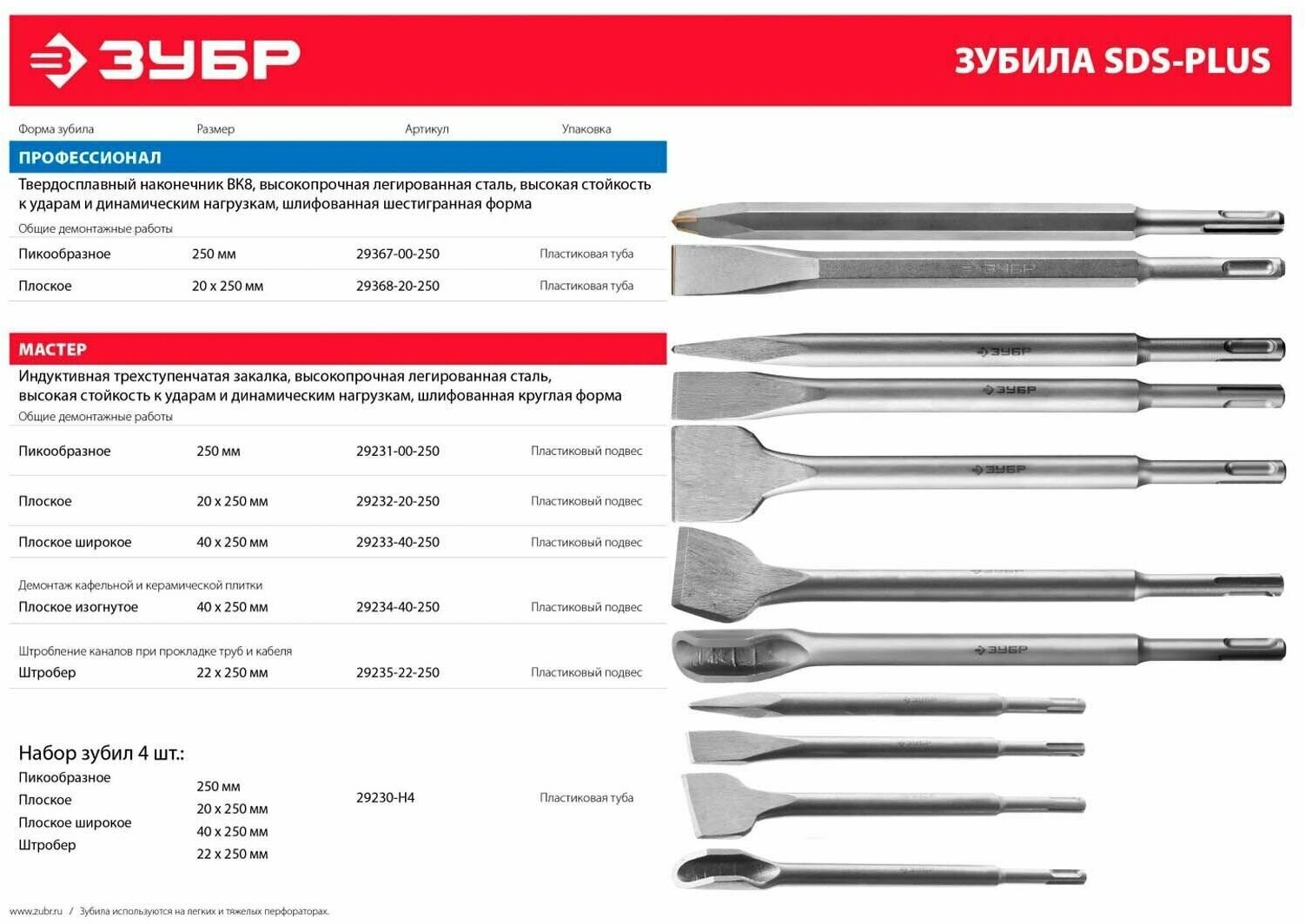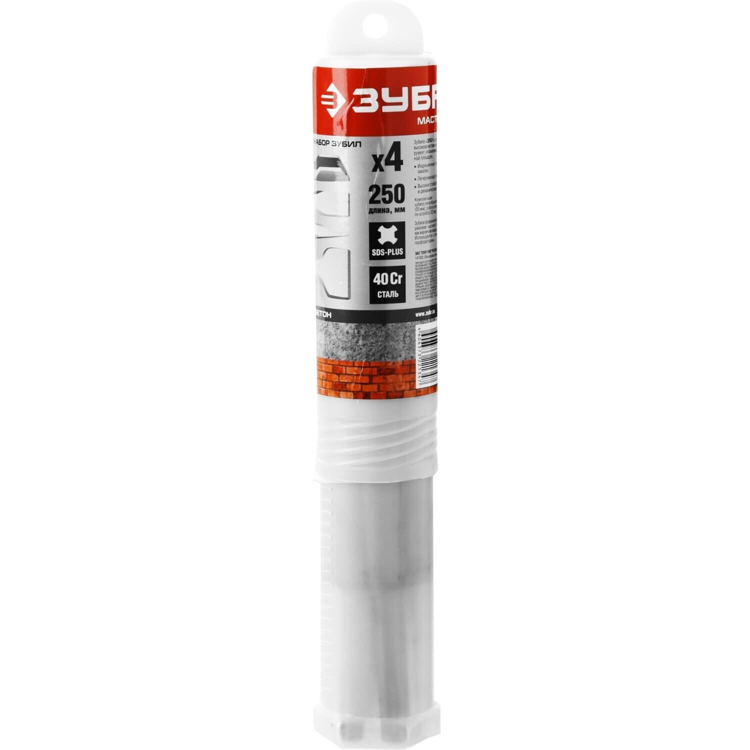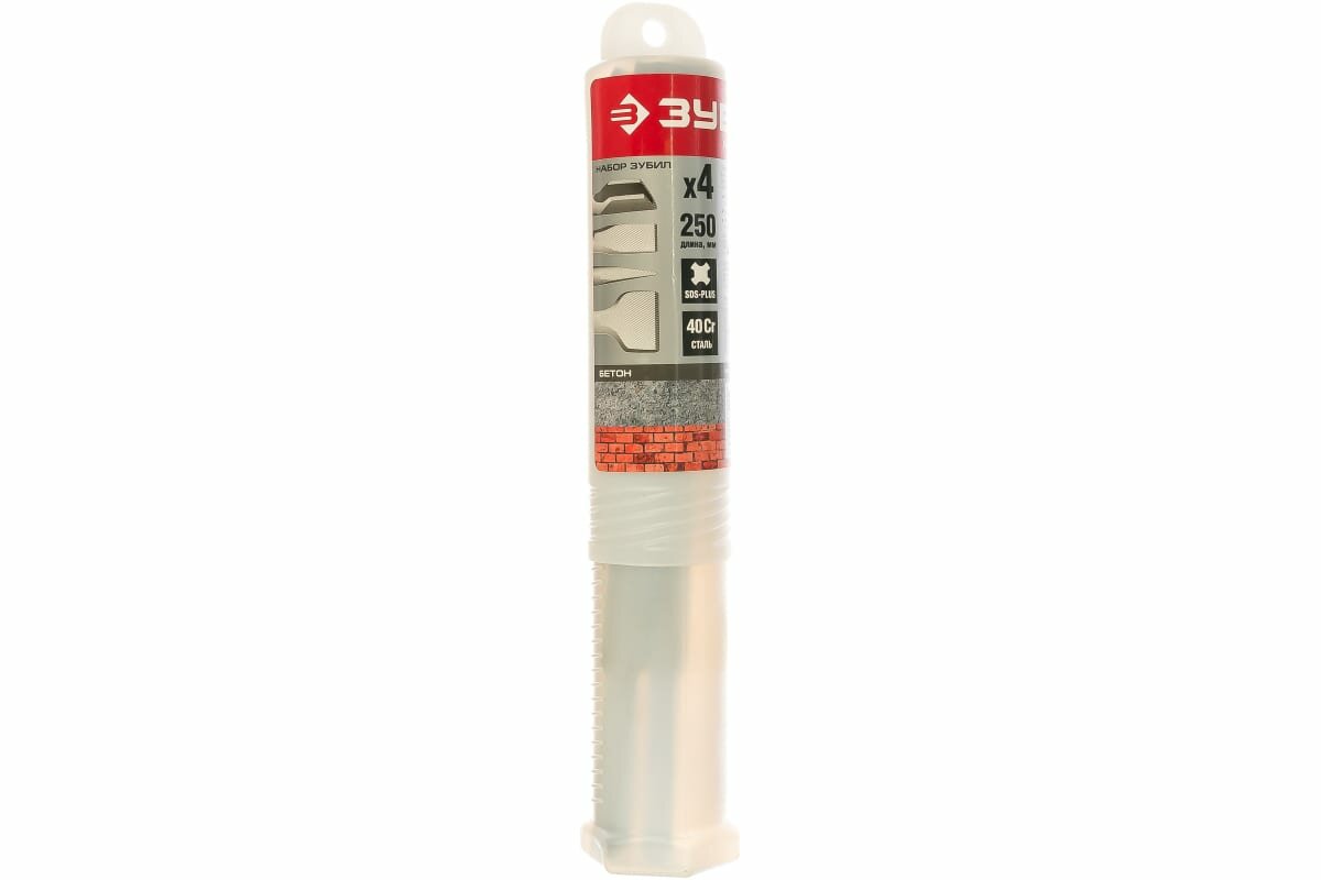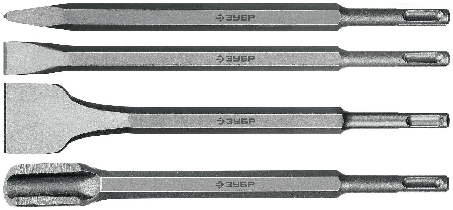 Набор зубил Зубр 250 мм, HSS-R, быстрорежущая сталь М2(S6-5-2) Р6М5, класс А 4 шт., SDS-plus