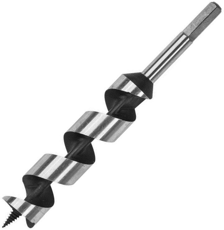 Изготовлены из высококачественной инструментальной стали. Спиральное центрирующее острие для быстрого захода в материал. Специальная форма шнека для быстрого вывода стружки и исключения заклинивания. Шестигранный хвостовик обеспечивает надежную фиксацию в сверлильном патроне без проскальзывания. Сверла Левиса предназначены для точного и быстрого сверления больших брусов, балок, перекрытий из мягких и твердых пород дерева, а также ДСП и фанеры. Размер: 35x600 мм.