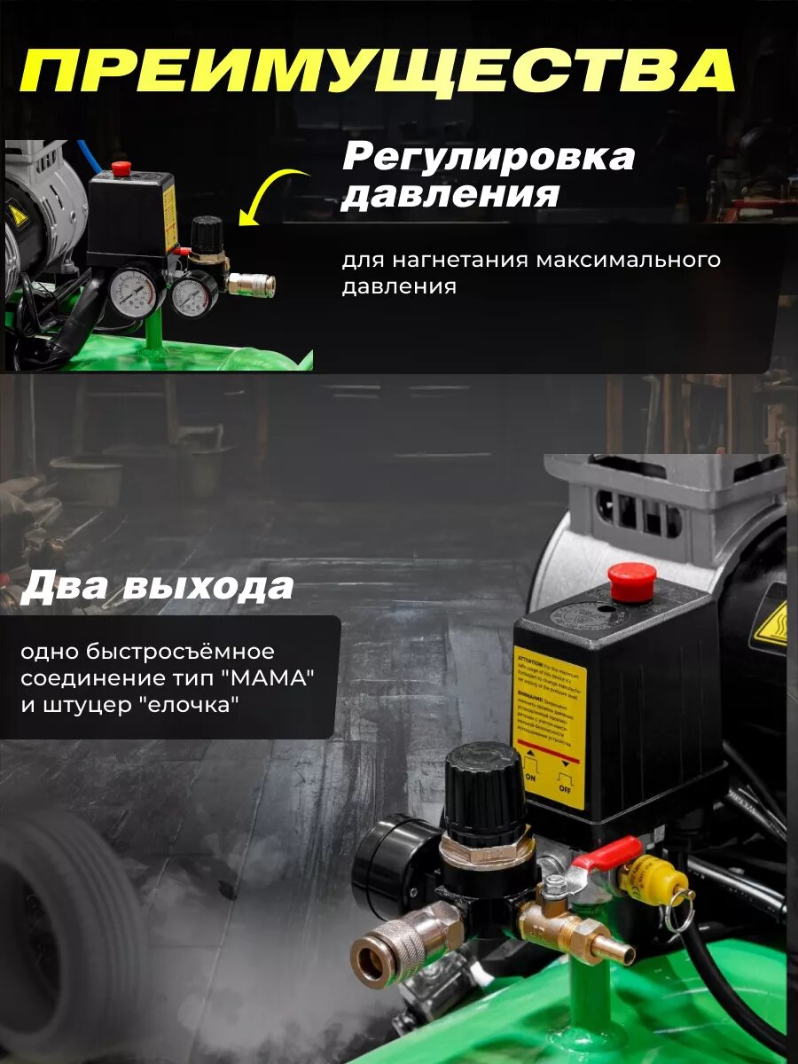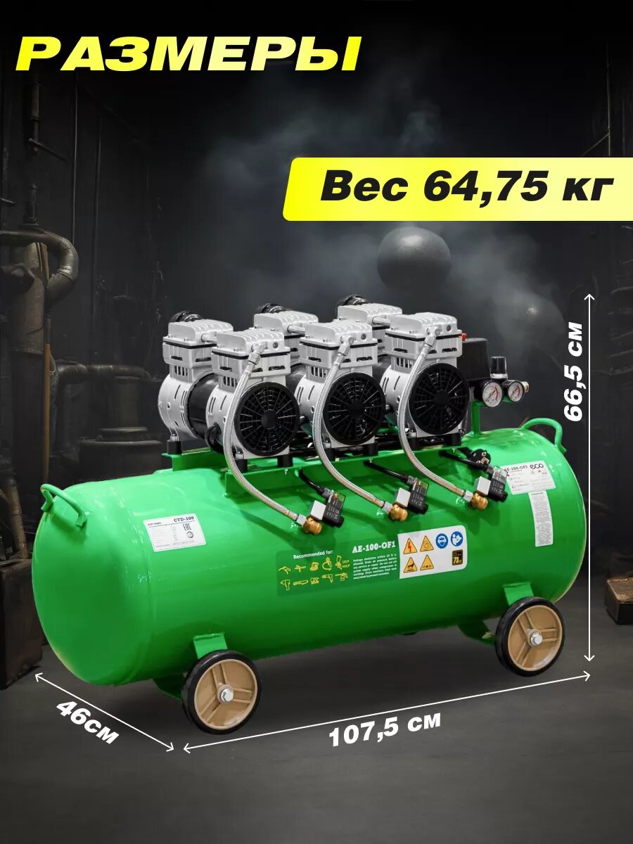 Компрессор безмасляный Eco для использования не требует заливки масла. Имеет3 высокопроизводительных и тихих бесщеточных электродвигателя с защитой от перегрузки.4 прорезиненных колеса и ручки на ресивере предназначены для удобства транспортировки.Преимущества 6-цилиндровый (3 компрессорные группы с 6 цилиндрами) Манометр давления в ресивере Манометр давления на выходе 2 выхода (быстросъемное соединение тип "МАМА" и штуцер "елочка") Регулятор давления Воздушные фильтры с бумажными фильтроэлементами