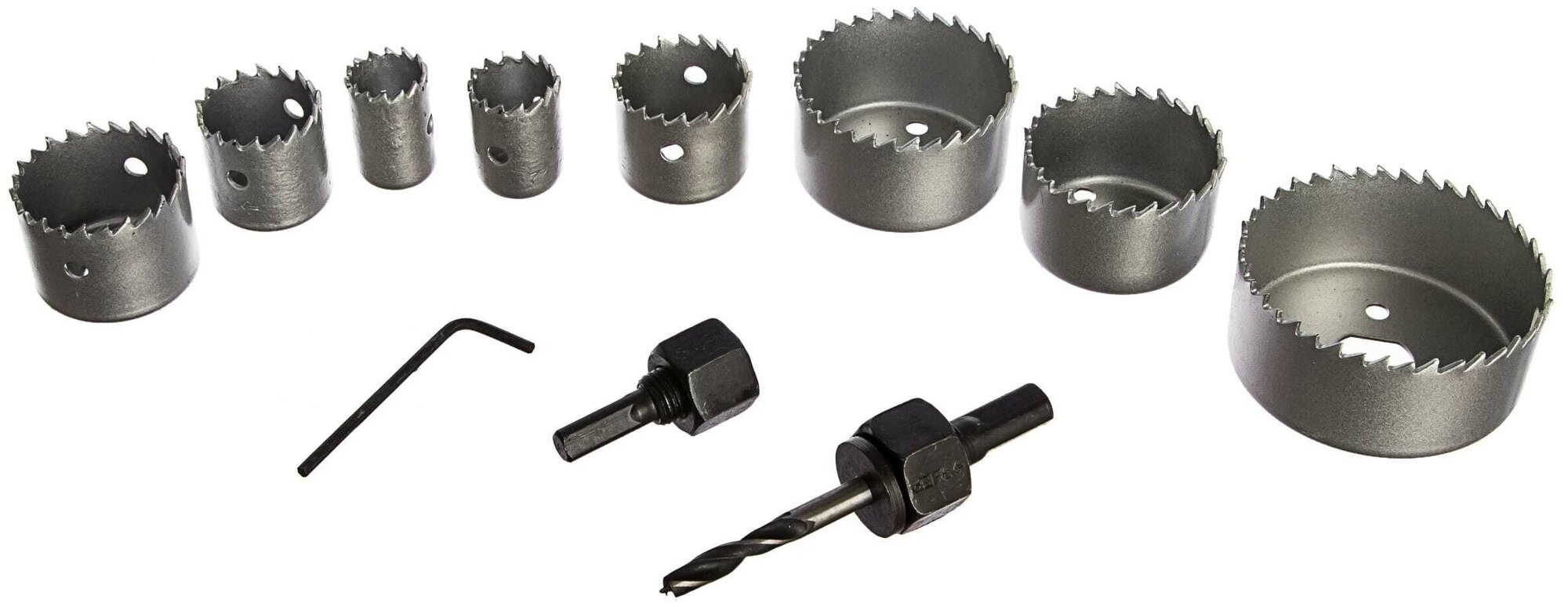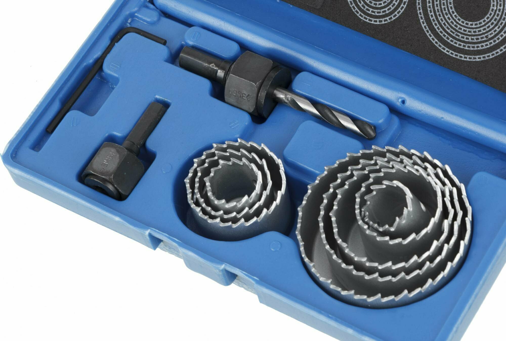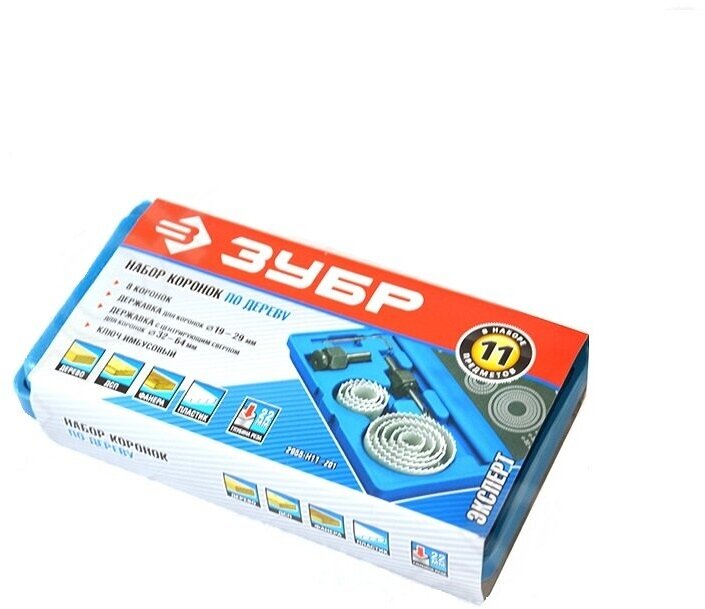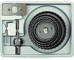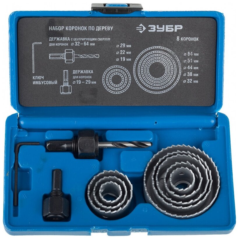 | Прочие особенности и свойства | 11 предметов в наборе:- коронки-чашки, 8 шт.:O19, 22, 29, 32, 38, 44, 51, 64 мм - державка на 19-29 мм - державка на 32-64 мм с центрирующим сверлом и опорным основанием - шестигранный ключ |