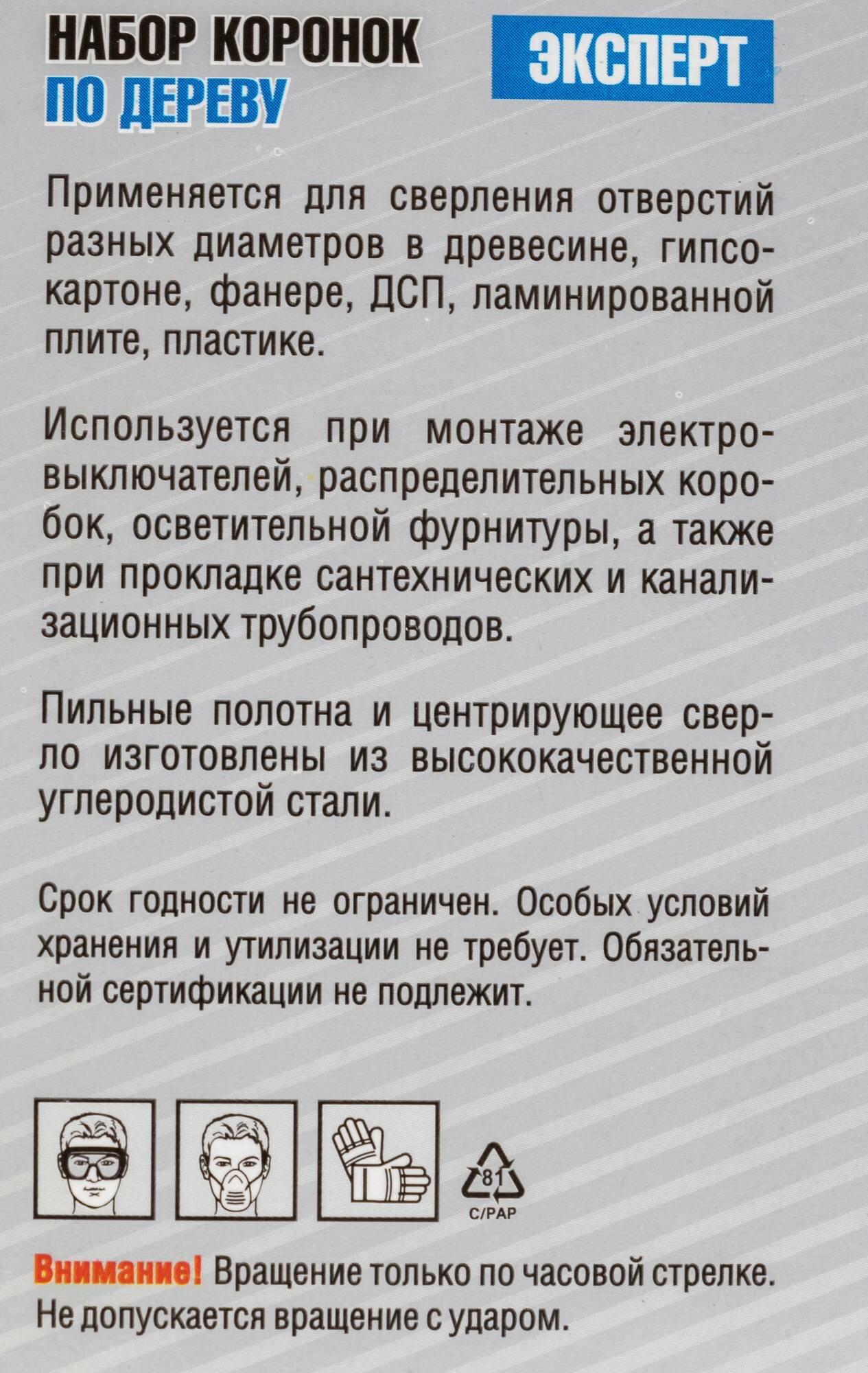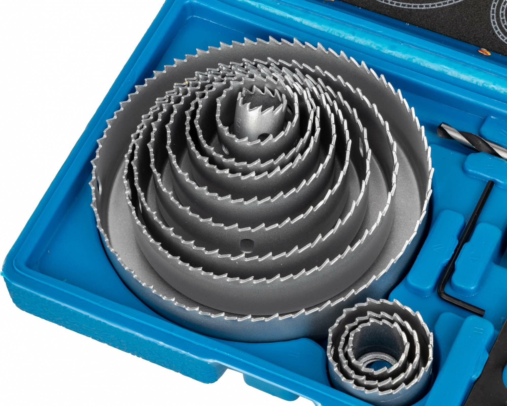 Использование высококачественных материалов и самых современных методов изготовления позволяют получать отверстия большого диаметра в древесине, фанере, ДСП, клееных щитах и пластмассе. А оптимально подобранная комплектация содержит наиболее востребованные размеры. В наборе 12 штук диаметром 19-127 мм.