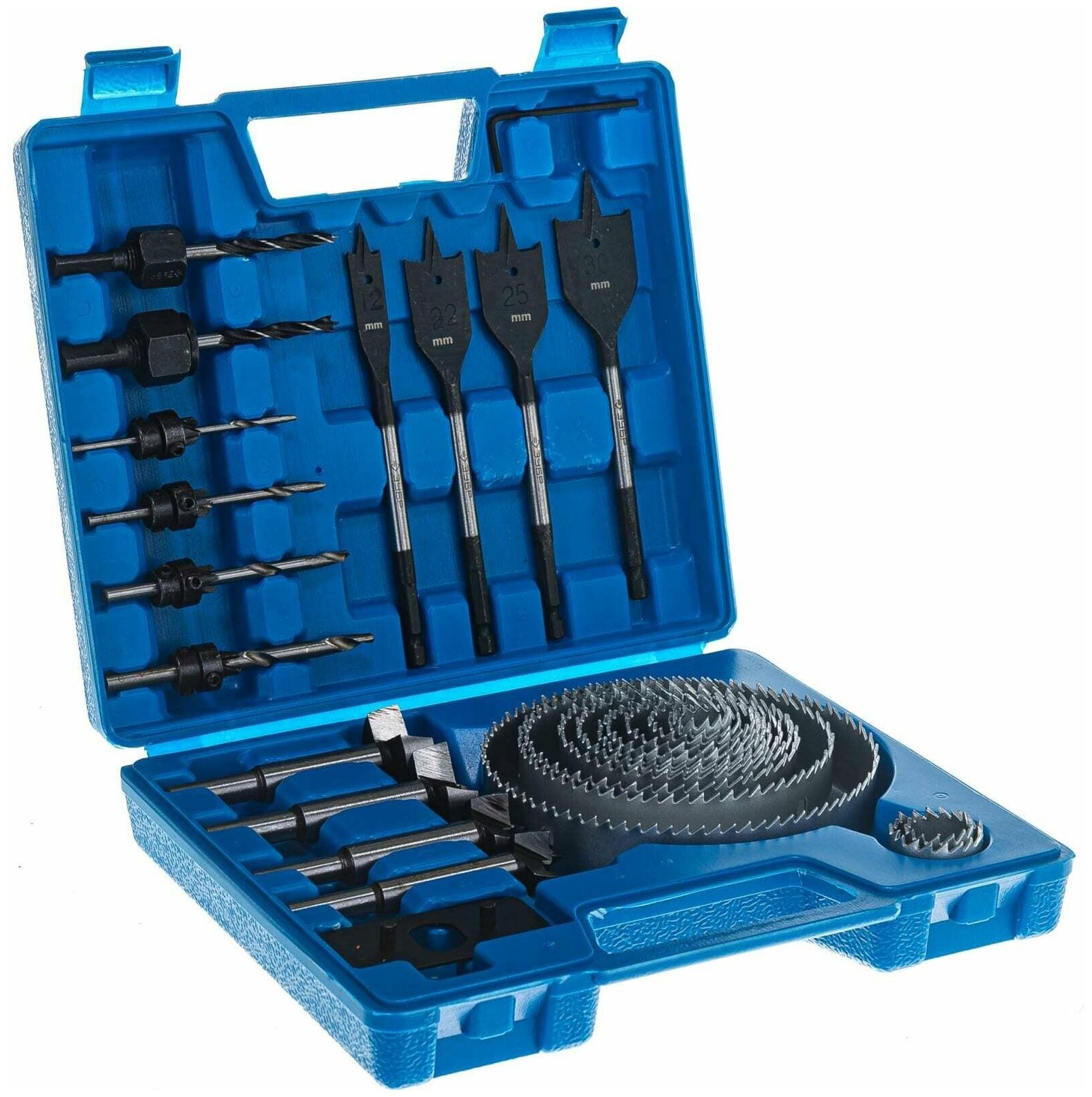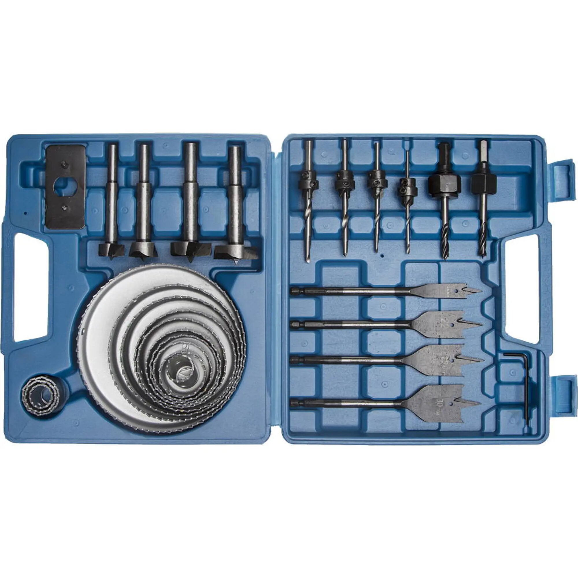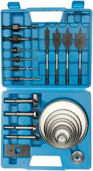 Использование высококачественных материалов и самых современных методов изготовления позволяют получать отверстия большого диаметра в древесине, фанере, ДСП, клееных щитах и пластмассе. А оптимально подобранная комплектация содержит наиболее востребованные размеры. В наборе 28 штук диаметром 19-127 мм.
