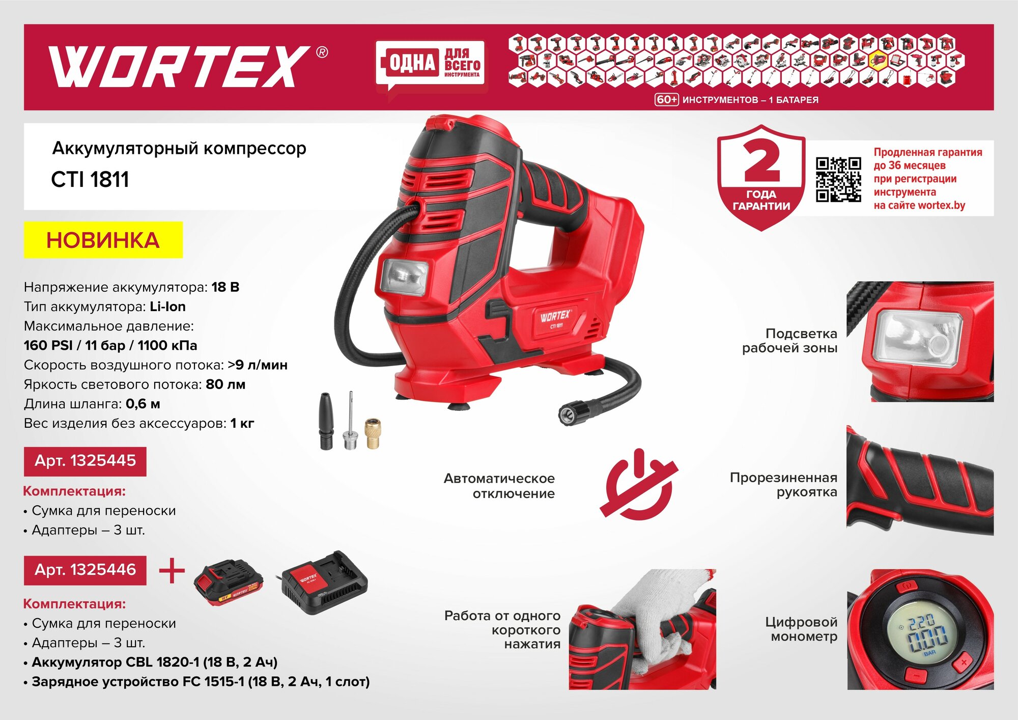 Аккумуляторный компрессор Wortex 1325446 в коробке ALL1 МЕГА 18 В 11 бар 12 л/мин 1х2 А*ч зу CTI 1811