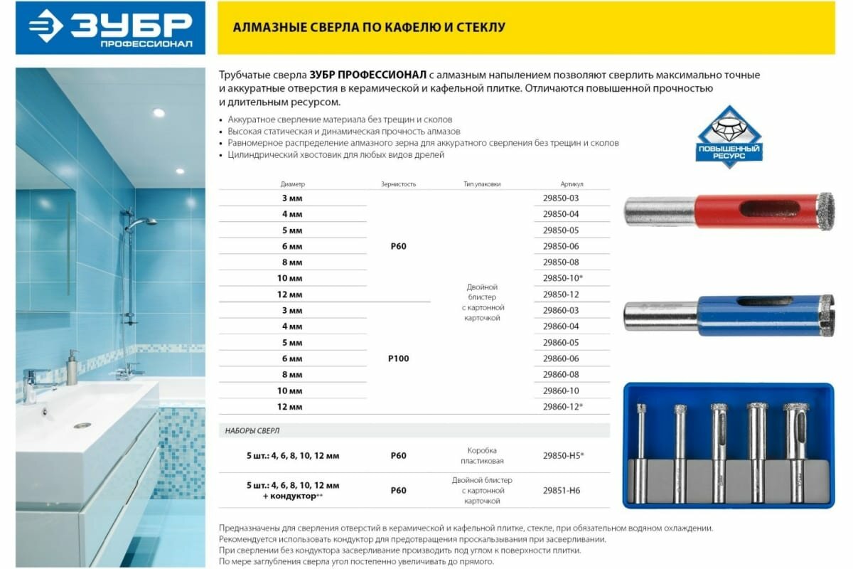 Алмазные трубчатые сверла ЗУБР профессионал отличаются повышенной прочностью и долгим сроком службы. Применяются для сверления отверстий в керамической и кафельной плитке при обязательном водяном охлаждении.