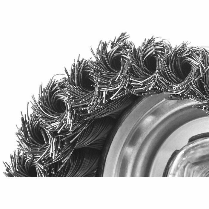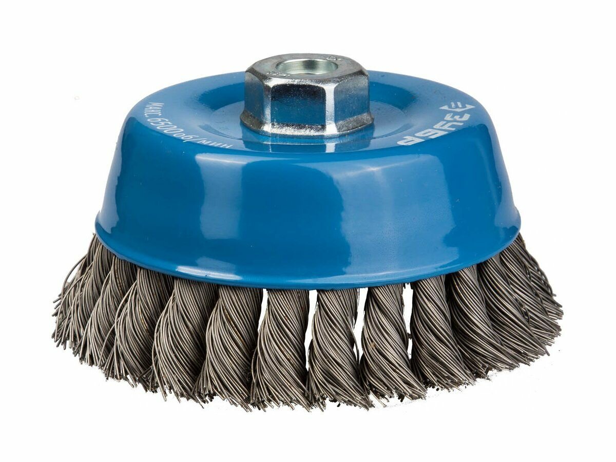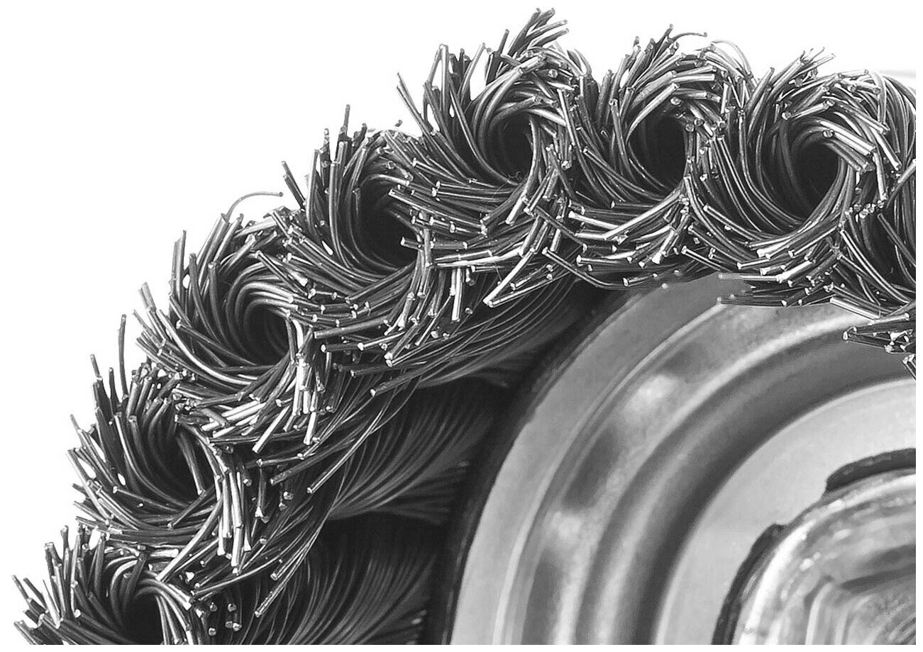 Чашечная щетка - это агрессивный шлифовально-зачистной инструмент, предназначенный для обработки деталей и заготовок, произведенных из стали и цветных металлов. Рабочая часть данной модели щеток изготавливается из закаленной стальной проволоки, сплетенной в тугие жгуты, поэтому такая насадка применяется для выполнения грубой обработки сильнозагрязненных поверхностей. Инструмент позволяет быстро и эффективно очищать места точечной сварки, сварные швы, въевшуюся ржавчину, толстый слой лакокрасочных покрытий и многое другое.