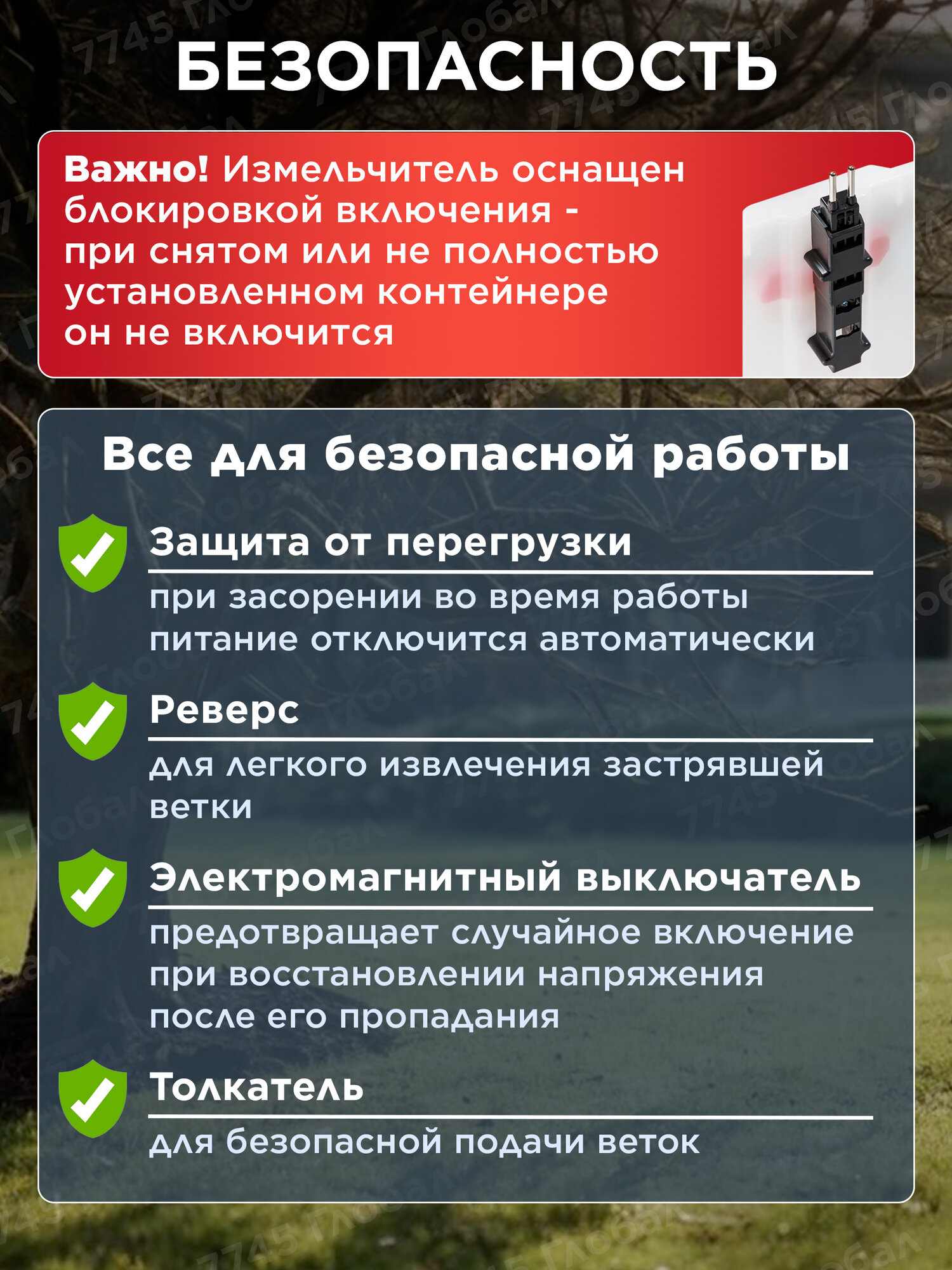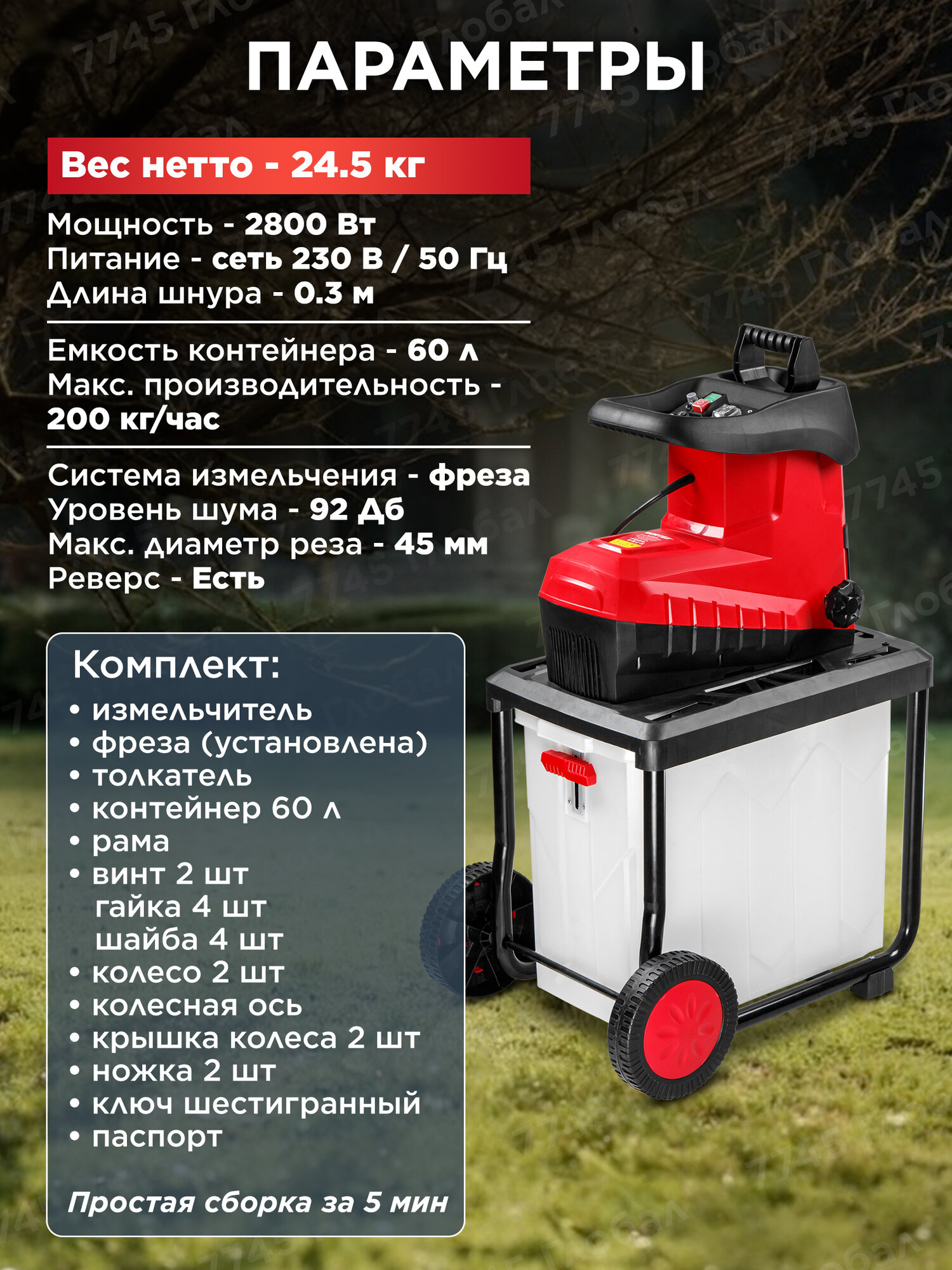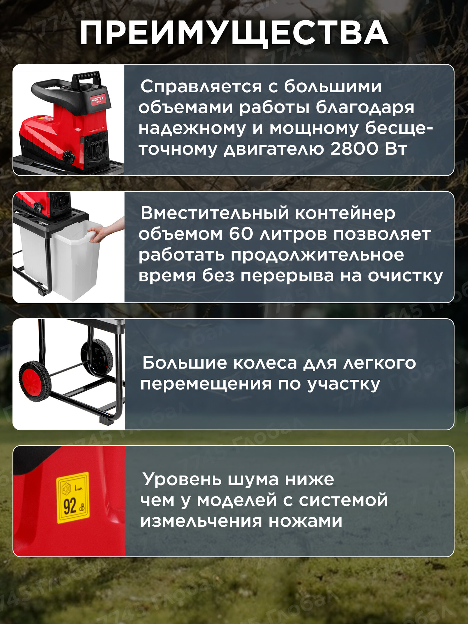 Садовый измельчитель Wortex применяется для дробления срезанных веток, сучье и кустарников, а также других растительных отходов. В результате измельчения получается щепа или мягкая масса с мелкой структурой.Преимущества: Оснащен надёжным бесщёточным двигателем 2.8 кВт, который имеет простую конструкцию и удобен в обслуживании, а также имеет низкий уровень шума, что обеспечивает комфортную работу на участке Обладает функцией защиты от перегрузки (если измельчитель засорится во время работы - питание отключится автоматически) и реверсом для безопасной работы Наличие толкателя и вместительного 60 л контейнера сделает работу комфортной и безопасной Электромагнитный выключатель предотвращает случайное включение при восстановлении напряжения после его пропадания Большие колёса обеспечивают удобную транспортировку