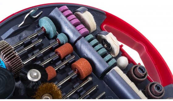 | Рабочие характеристики | Ленты абразивные – 10 шт,Насадка полировальная тканая дисковая – 1шт,Насадка фетровая дисковая – 1 шт,Насадки фетровые цилиндрические – 4 шт,Державка для фетровых насадок – 1 шт,Державки для абразивных лент – 2 шт,Алмазные шарошки – 4 шт,Металлическая шарошка – 1 шт,Абразивные шарошки по металлу с хвостовиком (оранжевые) – 3 шт,Абразивные дисковые шарошки по металлу (оранжевые) – 6 шт,Абразивные шарошки по камню с хвостовиком (серо-зелёные) – 2 шт,Абразивные дисковые шарошки по камню (серо-зелёные) – 6 шт,Щетки-крацовки абразивно-полимерные – 2 шт,Щетки-крацовки из нержавеющей стали – 3 шт,Щетка-крацовка из латунированной стали – 1 шт,Паста полировальная – 1 шт,Отрезные круги по металлу с повышенным ресурсом – 30 шт,Отрезные круги по металлу стандартные – 46 шт,Шлифовальные круги – 45 шт,Цанги – 3 шт,Державка для отрезного круга – 1 шт,Державка для фетровых насадок – 1 шт,Державка для тканой дисковой насадки – 1 шт,Отрезные абразивные круги армированные – 2 шт,Ключ-отвертка – 1 шт,Круг лепестковый веерный на шпильке (Р80) – 1 шт,Брусок абразивный правочный – 1 шт,Пластиковый кейс |
