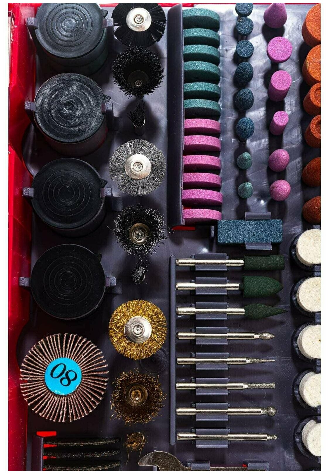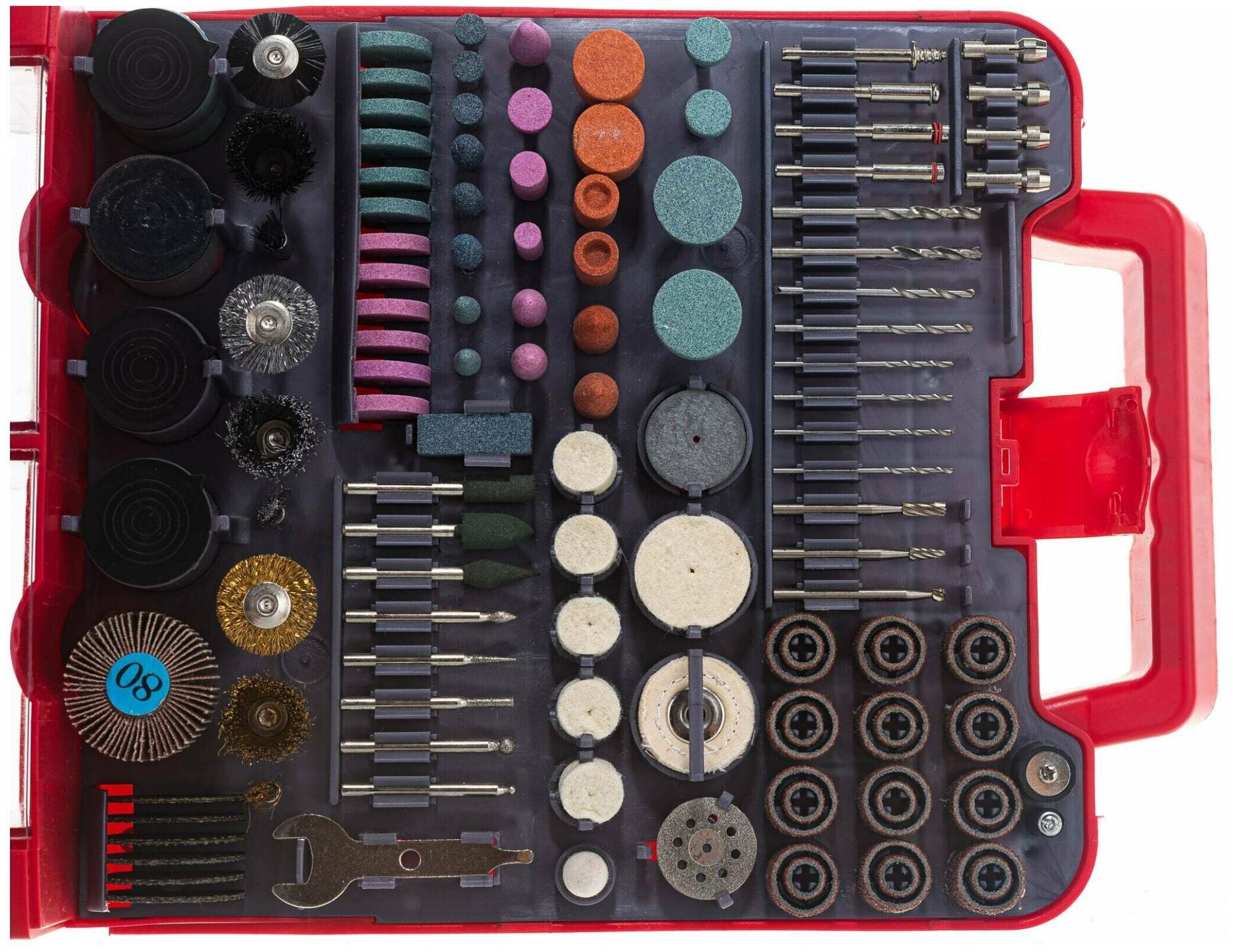 | Оснастка в комплекте | абразивные шарошки по металлу с хвостовиком (розовые и оранжевые) – 12 шт.; абразивные шарошки по камню с хвостовиком (серо-зелёные) – 12 шт.; абразивные дисковые шарошки по металлу (розовые) – 6 шт.; абразивные дисковые шарошки по камню (серо-зелёные) – 6 шт.; сверла по металлу 1,6 х 42 мм – 4 шт.; сверла по металлу 2,4 х 42 мм – 2 шт.; сверла по металлу 3,2 х 48 мм – 2 шт.; державки для отрезных кругов – 2 шт.; державка для фетровых насадок – 1 шт.; державка для полировальной тканой насадки – 1 шт.; резиновые шлифовальные насадки с хвостовиком – 3 шт.; металлические шарошки – 3 шт.; цанги – 4 шт.; щетки-крацовки абразивно-полимерные – 3 шт.; щетки-крацовки из нержавеющей стали – 3 шт. щетки-крацовки из латунированной стали – 3 шт. отрезные круги по металлу с повышенным ресурсом – 30 шт.; отрезные круги по металлу стандартные – 45 шт.; державки для шлифовальных лент – 2 шт.; брусок абразивный правочный – 1 шт.; насадки фетровые цилиндрические – 6 шт.; насадка полировальная тканая дисковая – 1 шт.; державка для фетровых кругов – 1 шт.; круг отрезной алмазный – 1 шт.; отрезные абразивные круги армированные – 6 шт.; шлифовальные круги – 44 шт.; круг лепестковый веерный на шпильке (р80) – 1 шт.; паста полировальная (21 г) – 1 шт.; ключ-отвертка – 1 шт.; державка для тканной дисковой насадки – 1 шт.; резиновая полировальная дисковая насадка – 1 шт.; ленты абразивные – 24 шт |