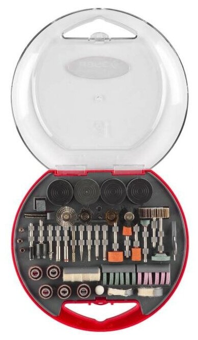 | Рабочие характеристики | Ленты абразивные – 10 шт,Насадка фетровая дисковая – 1 шт,Насадки фетровые цилиндрические – 5 шт,Насадка полировальная тканая дисковая – 1 шт,Резиновая полировальная дисковая насадка – 1 шт,Сверла по металлу 1,6 х 42 мм – 3 шт,Сверла по металлу 2,4 х 42 мм – 3 шт,Сверла по металлу 3,2 х 48 мм – 3 шт,Державки для абразивных лент – 2 шт,Алмазные шарошки – 9 шт,Металлические шарошки – 3 шт,Абразивные шарошки по металлу с хвостовиком (оранжевые) – 6 шт,Абразивные дисковые шарошки по металлу (розовые) – 4 шт,Абразивные шарошки по камню с хвостовиком (серо-зелёные) – 4 шт,Абразивные дисковые шарошки по камню (серо-зелёные) – 4 шт,Щетки-крацовки абразивно-полимерные – 3 шт,Щетки-крацовки из нержавеющей стали – 3 шт,Щетки-крацовки из латунированной стали – 3 шт,Паста полировальная (21 г) – 1 шт,Отрезные круги по металлу с повышенным ресурсом – 30 шт,Отрезные круги по металлу стандартные – 45 шт,Шлифовальные круги – 45 шт,Цанги – 4 шт,Державки для отрезных кругов – 2 шт,Державка для фетровых насадок – 1 шт,Державка для тканой дисковой насадки – 1 шт,Отрезные абразивные круги армированные – 5 шт,Ключ-отвертка – 1 шт,Круг лепестковый веерный на шпильке (Р80) – 1 шт,Брусок абразивный правочный – 1 шт,Пластиковый кейс |