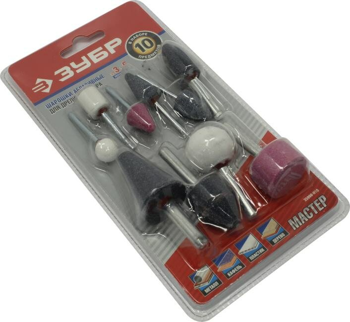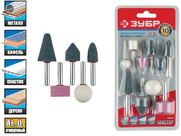 | Прочие особенности и свойства | Набор ЗУБР 35998-H10 – расходный инструмент для граверов и дрелей, используется при выполнении зачистных и шлифовальных работ по металлу, дереву, керамике, пластику и прочим материалам. В составе набора шарошки разной формы, благодаря чему их можно использовать при выполнении работ различной сложности. Набор идеально подойдет для работы в труднодоступных местах. |