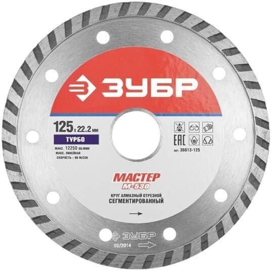 Круг отрезной алмазный ЗУБР «МАСТЕР» «ТУРБО» — это качественный инструмент для сухой резки, предназначенный для использования с угловой шлифовальной машиной (УШМ). Он имеет сегментированную структуру и подходит для обработки таких материалов, как бордюрный камень, тротуарная плитка и облицовочный кирпич.Преимущества Оригинальная сегментированная форма режущей кромки позволяет быстро и эффективно осуществлять необходимые резы в обрабатываемом материале Высококачественные синтетические алмазы Оптимально подобранные компоненты металлической связки гарантируют продолжительный рабочий ресурс диска при работе даже с самыми сложными в обработке материалами Сегментированная режущая кромка обеспечивает эффективную работу без принудительного охлаждения