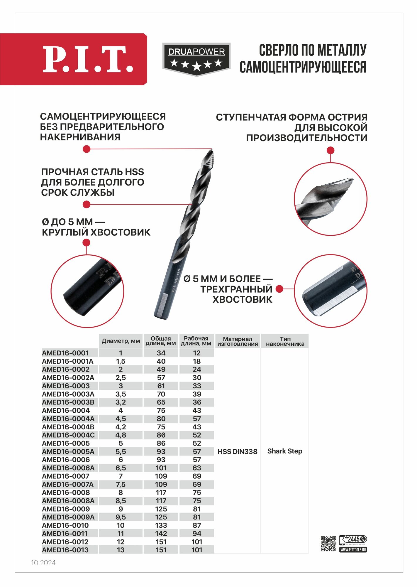 Сверло по металлу P.I.T. , самоцентрирующееся, HSS, Ø4мм, 75х43мм, SharkStep - высокопроизводительные и прочные спиральные свёрла по металлу. Благодаря особой форме заточки, при начале сверления свёрла хорошо центрируются на металлической заготовке без предварительного накернивания, что особенно важно при сверлении круглых заготовок. Ступенчатая форма острия Shark Step существенно увеличивает скорость засверливания и дальнейшего сверления. Начиная с диаметра 5 мм свёрла имеют трёхгранный хвостовик, что исключает проворачивание в патроне при высоких нагрузках.Преимущества Ступенчатая форма острия для высокой производительности Самоцентрирующееся без предварительного накернивания Прочная сталь HSS для более долгого срок службы Высокая точность исполнения обеспечивает точные круглые отверстия