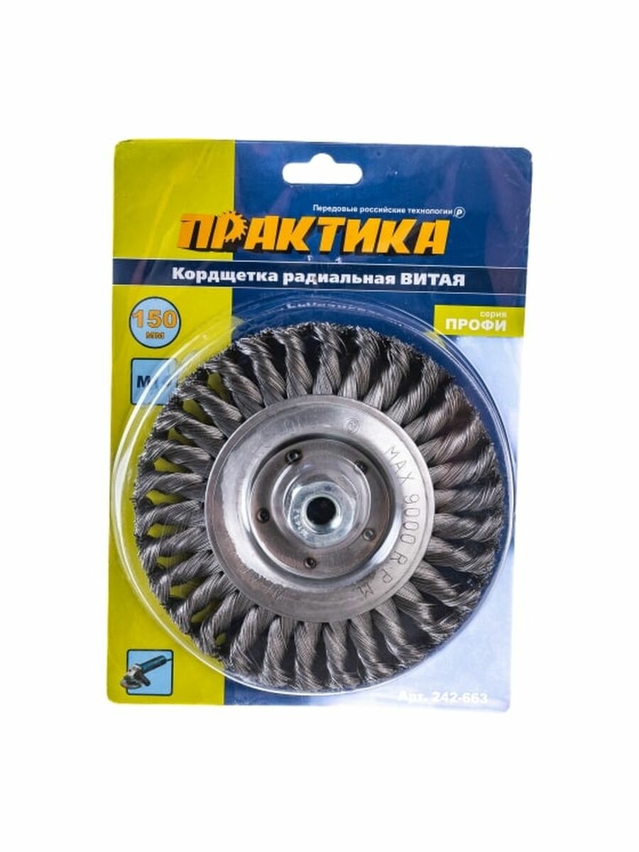 Кордщетка Практика снабжается переходником с резьбой М14, что позволяет эксплуатировать ее с угловой шлифовальной машиной. Отличаясь наружным диаметром 150 мм, насадка в виде колеса имеет рабочую часть из витой латунированной проволоки диаметром 0.5 мм, что гарантирует ее высокую эффективность при работе по металлическим поверхностям. Изделие позволяет выполнять зашлифовку сварных швов, гарантирует эффективность удаления ржавчины и загрязнений, в том числе из труднодоступных мест деталей, может применяться для снятия старых лакокрасочных покрытий.