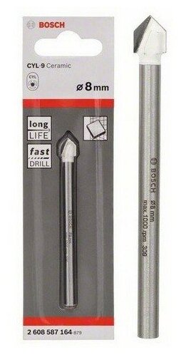 Можно использовать на фарфоре и керамике, удобное крепление, совместимость с шуруповертом и дрелью, фирменное производство от бош, размер 8*80
