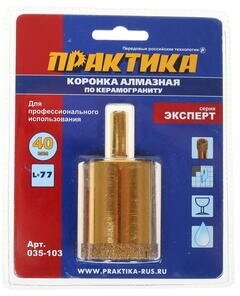 Садовый инструмент Практика 035-103 «ПРАКТИКА» серии «ЭКСПЕРТ» 035-103 - это алмазная коронка, изготовленная из высококачественного материала. Она предназначена для сверления отверстий в керамограните, напольной плитке высокой твердости, стекле и бетоне. Ее размер составляет - 40 x 77 мм. Рекомендуется работать с помощью кондуктора (приобретается отдельно) для предотвращения проскальзывания при начальном засверливании.