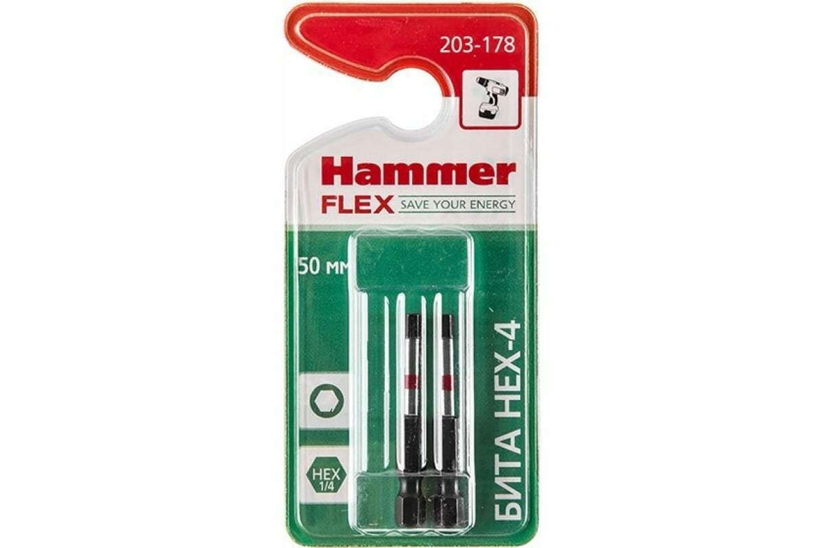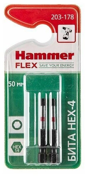 | Прочие особенности и свойства | Название на английском Power bit Hammer Flex 203-178 HEX-4 50mm, 2pcs . |