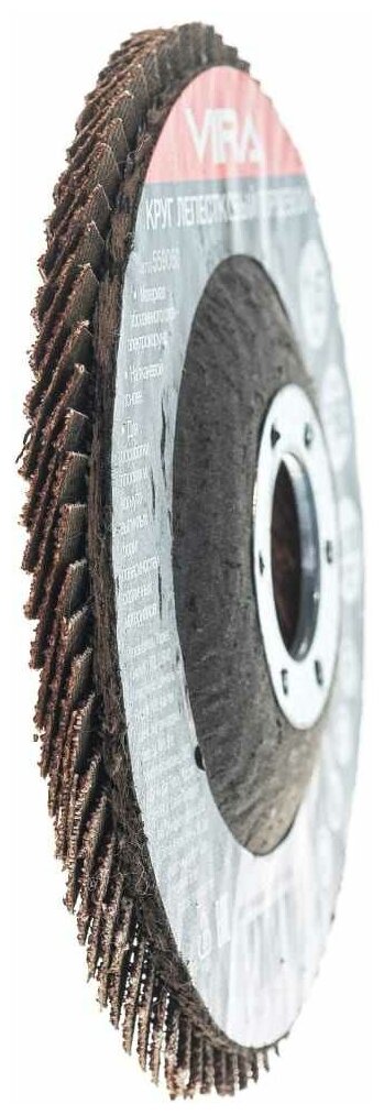 Круг Vira лепестковый торцевой 115mm P60. Абразивный круг на тканевой основе предназначен для обработки плоских и вогнуто-выпуклых форм поверхностей различных материалов (металла, пластика, древесины). Использование оксида алюминия (электрокорунда) в качестве абразивного материала отлично подходит для шлифования сталей и сплавов. Круг легко устанавливается и заменяется, по необходимости, на подобный.