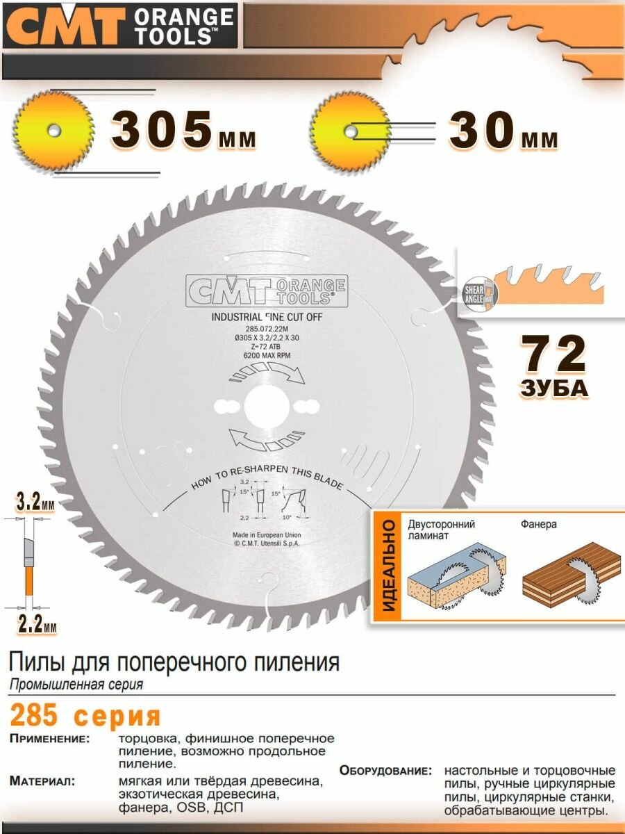 На сегодняшний день товар «Пильный диск по дереву фанере для поперечного реза CMT 285.072.22m» можно купить с кешбеком в 1 магазине: Яндекс.Маркет