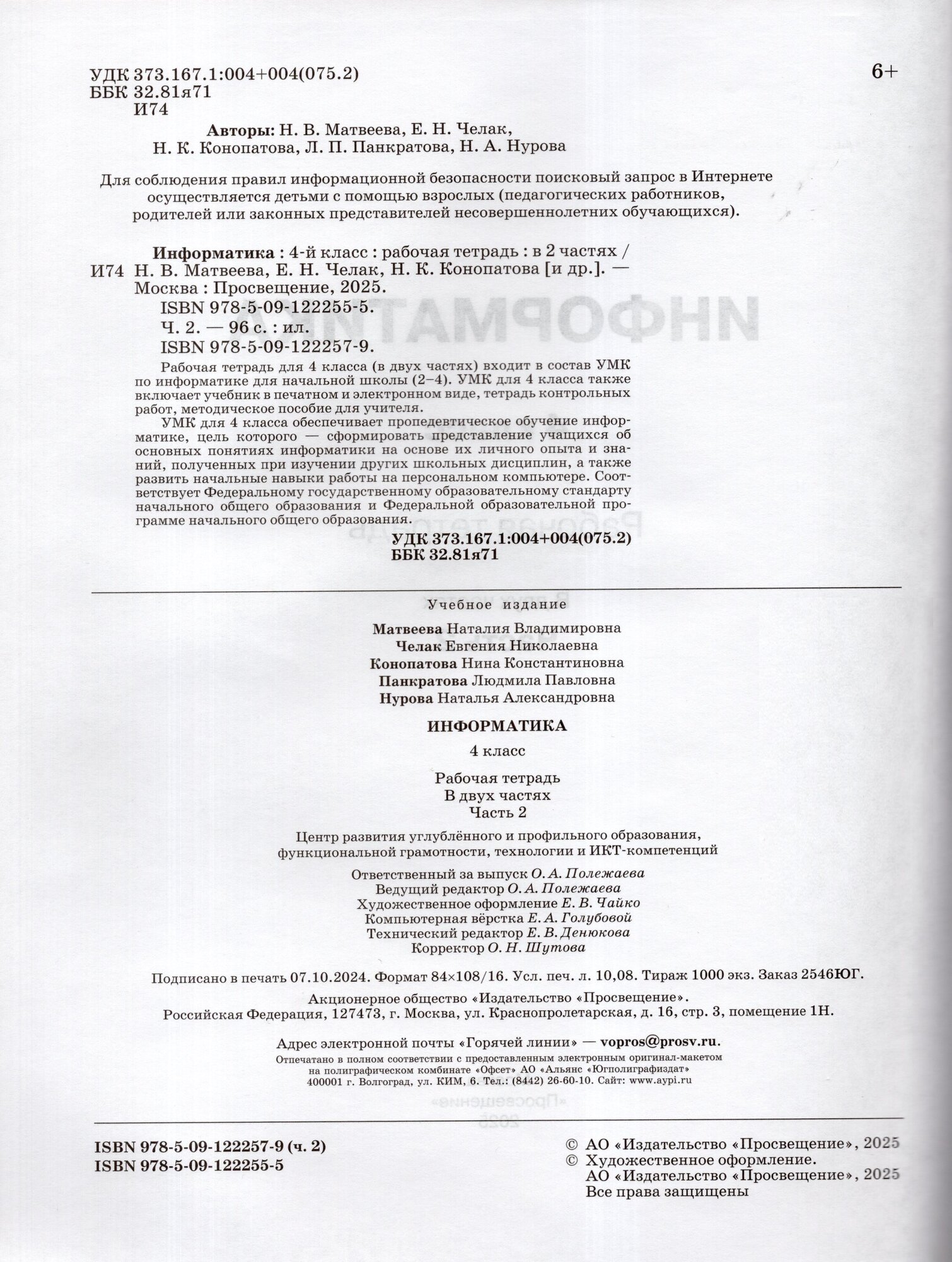 Информатика. 4 класс. Рабочая тетрадь. В двух частях. Часть 2. ФГОС 2021 (Евгения Николаевна Челак, Нина Константиновна Конопатова, Наталья Владимировна Матвеева); Просвещение, 2025