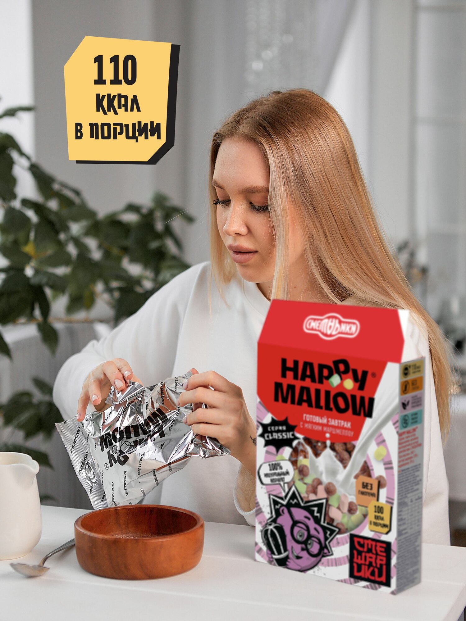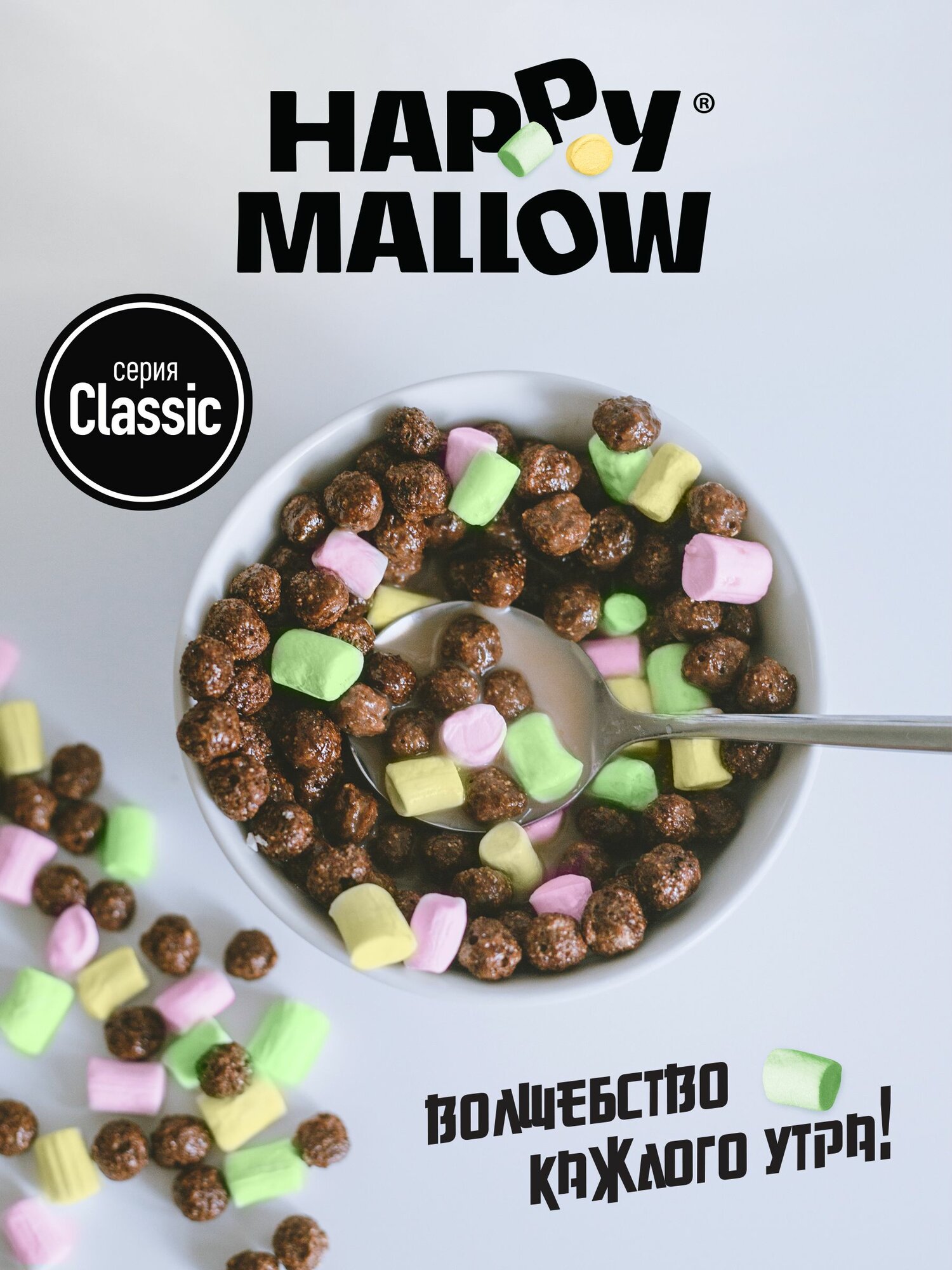 Начните утро с чего-то особенно нежного в компании со Смешариками! Попробуйте шоколадные кукурузные шарики Happy Mallow Смешарики c мягким маршмеллоу!Натуральный готовый завтрак обогащен витаминами и железом и не содержит глютен. Шоколадные шарики с маршмеллоу — прекрасный выбор для того, чтобы начать день легко и создать себе классное настроение.Потрясающее сочетание шоколадных кукурузных шариков с мягким воздушным зефиром приятно удивит больших и маленьких сладкоежек.Хранить при температуре не выше 20 °С и относительной влажности воздуха не более 75 %. После вскрытия хранить в плотно закрытом пакете.