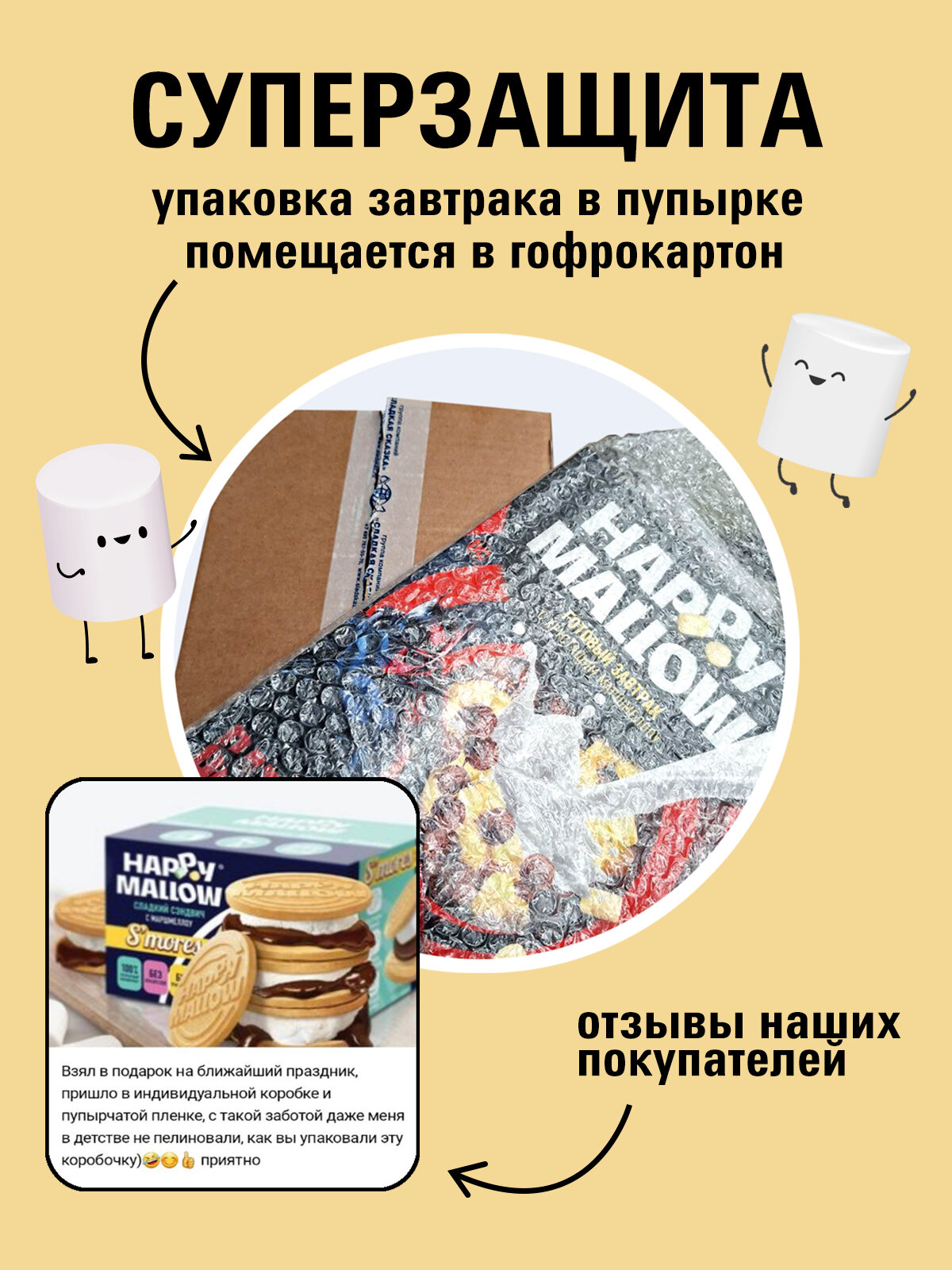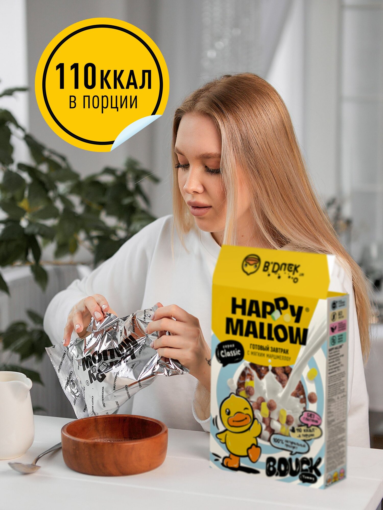 Встречайте готовый завтрак Happy Mallow с хрустящим маршмеллоу под лицензией «Приключения Пети и Волка»! «Приключения Пети и Волка» — ситком с элементами фэнтези и фольклора, созданный киностудией «Союзмультфильм» совместно с компанией «Кинопоиск». Нестандартный, актуальный юмор и нотки абсурда в сюжете роднят мультфильм с международными хитами: «Рик и Морти», «Футурама» и «Гравити Фолз». Готовый завтрак с хрустящим маршмеллоу отлично сочетается с настроением мультсериала — позитивным, весёлым и немного хулиганским. Это 100% натуральный продукт, который не содержит глютен. Шоколадные шарики с маршмеллоу — прекрасный выбор для того, чтобы начать день легко и создать себе классное настроение. Потрясающее сочетание шоколадных кукурузных шариков с хрустящим воздушным зефиром приятно удивит больших и маленьких сладкоежек. Продукт производится на нашей фабрике «МАК-Иваново».