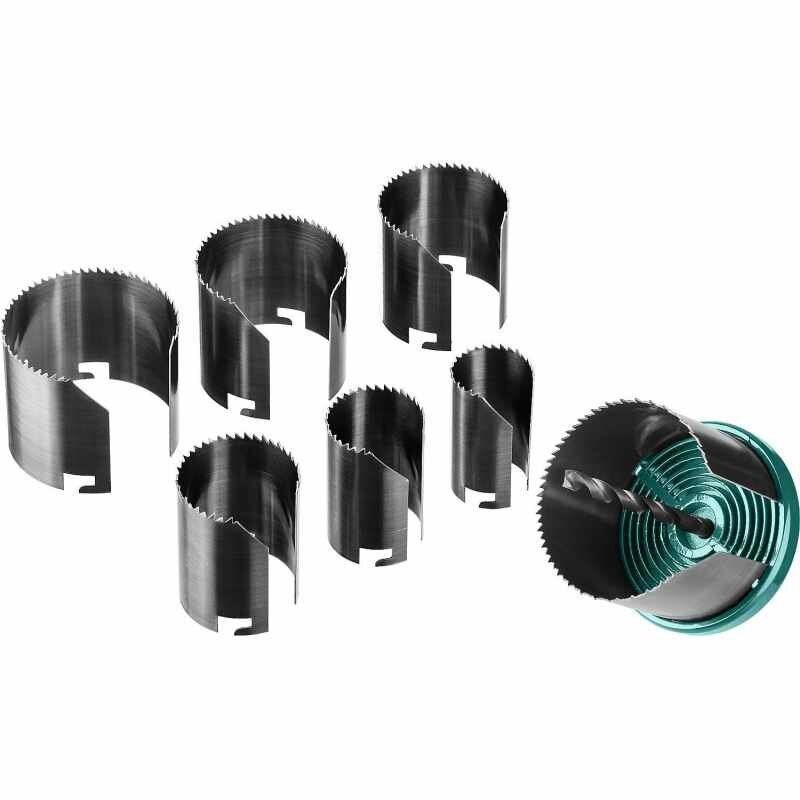 Пила кольцевая KRAFTOOL наборная по дереву, 7 полотен: 25-32-38-45-50-56-62х42мм - предназначена для работ по дереву и помогает быстро просверлить отверстия различных диаметров глубиной от 25 до 100мм, предназначенных для розеток, потолочных светильников и распределительных коробок. Подходит в качестве насадки для дрели (электрической и ручной).