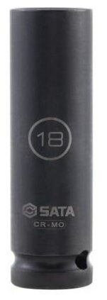 Головка торцевая ударная глубокая 1/2" 6-гранная 18мм SATA 1/2"DR. IMPACT DEEP SOCKETS 18MM. Головка торцевая ударная глубокая, размер 18 мм, 6-гранная (шестигранная). Под вороток 1/2 дюйма. Для использования с ударными гайковёртами. Изготовлено из хром-молибденовой стали, которая отличается повышенной жесткостью и ударопрочностью. Обработка фосфатом марганца способствует защите от корозии. ! При использовании ударного инструмента следует обязательно надевать средства защиты глаз !
