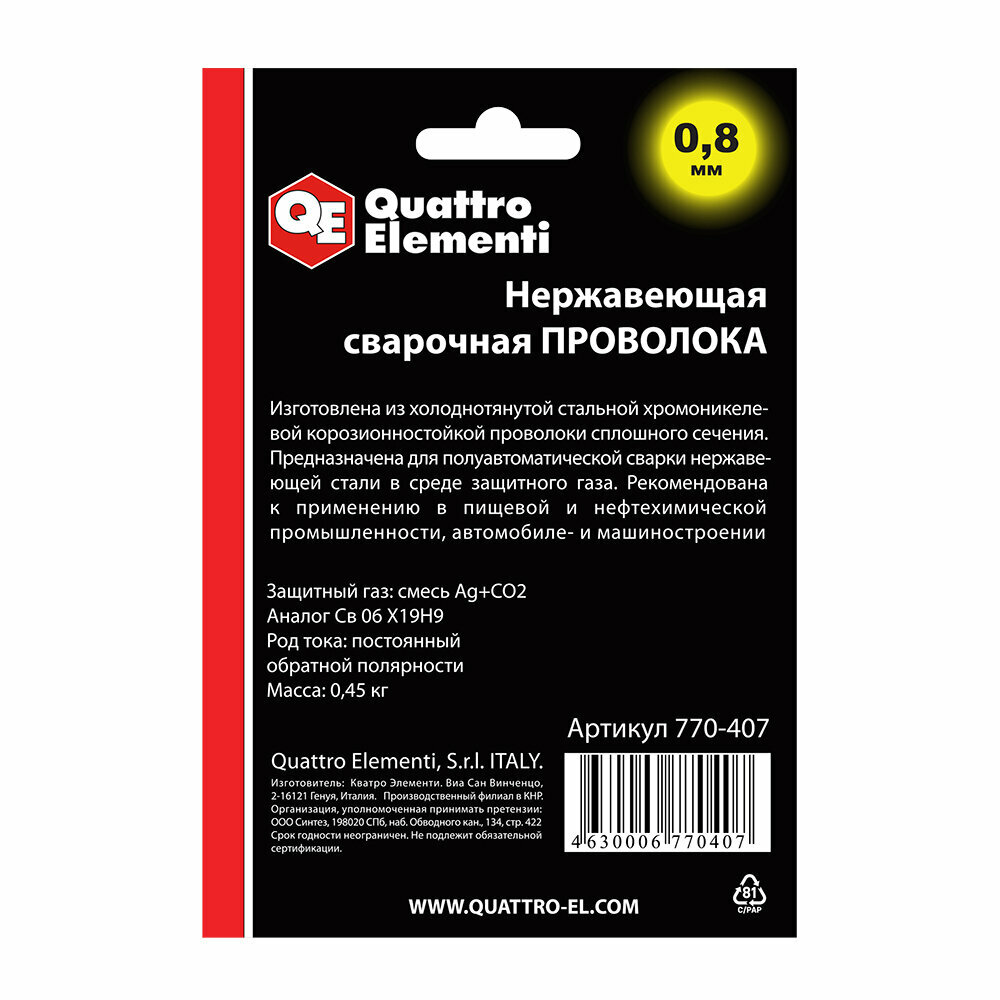 На сегодняшний день товар «Сварочная проволока QUATTRO ELEMENTI 770-407» можно купить с кешбеком в 1 магазине: Яндекс.Маркет