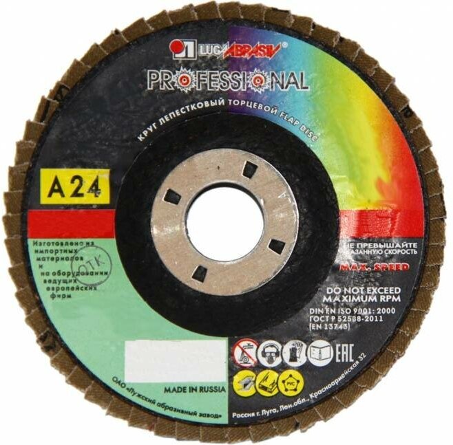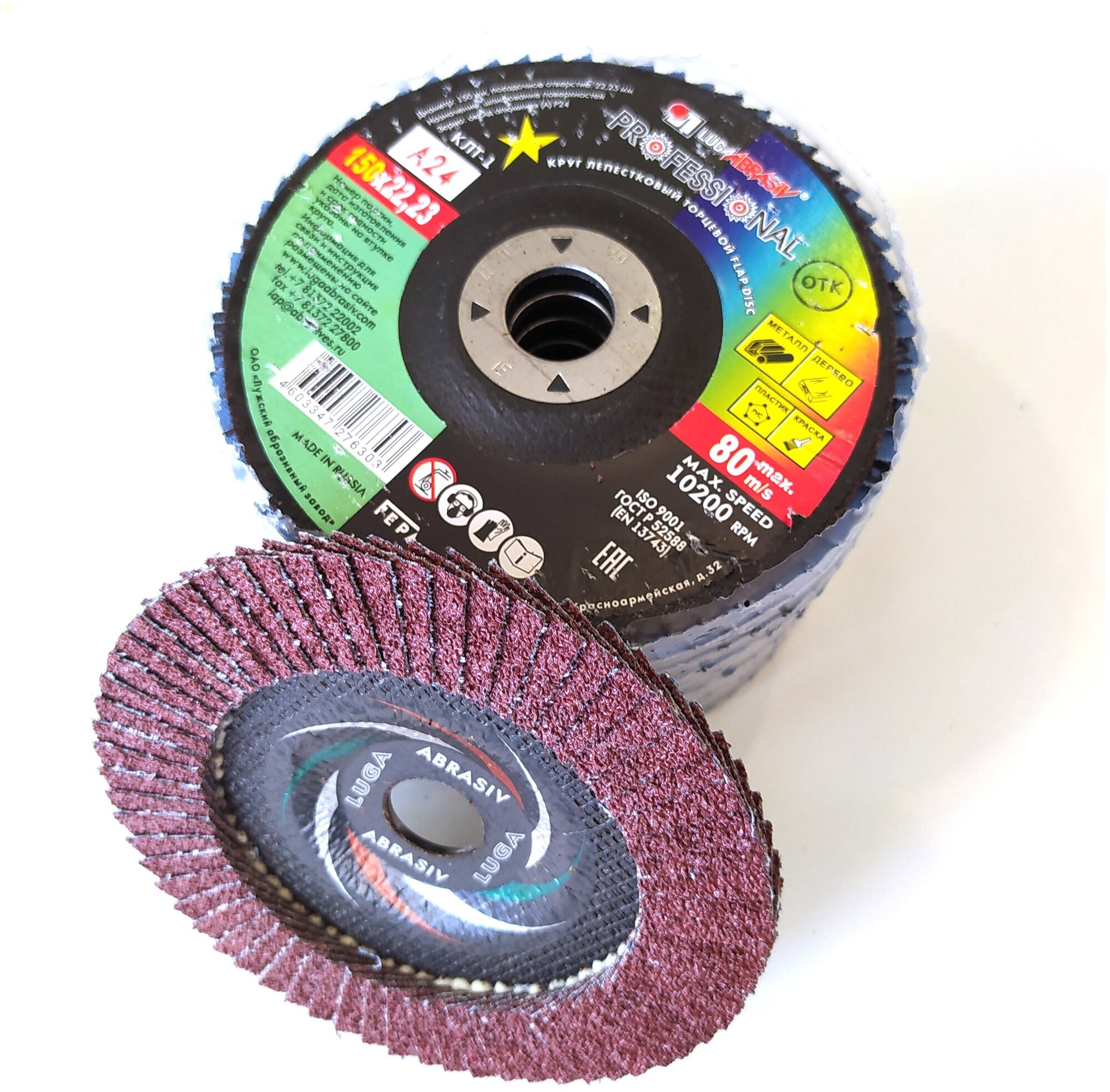 Круг лепестковый ЛУГА применяется для плоского шлифования, обработки кромок и сварных швов деталей и конструкций различных марок сталей, цветных металлов и древесины, снятия ржавчины, заусенцев. Зернистость 24Р.
