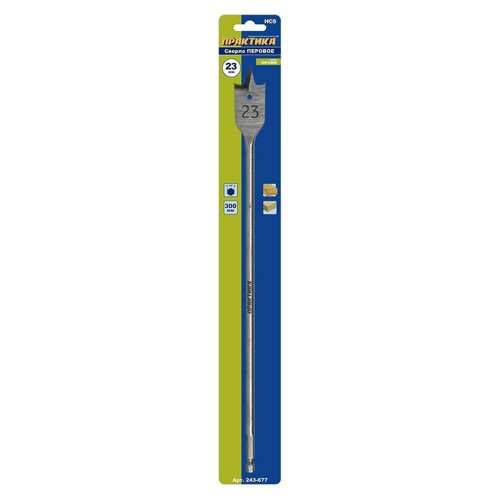 Сверло по дереву перовое (плоскофрезерное) удлиненное 23х300 мм Практика предназначено для сверления отверстий в строительной древесине: доске, брусе; фанере, ДСП, OSB, гипсокартоне с помощью дрели или аккумуляторного шуруповерта. Изготовлено из высококачественной углеродистой инструментальной стали (HCS). Профиль с боковой подрезкой обеспечивает высокую скорость сверления и аккуратные кромки отверстия на лицевой стороне. Шестигранный хвостовик 1/4'' (6,35 мм) для прочного удержания в патроне без проскальзывания, также совместим со стандартными держателями для бит, что ускоряет смену инструмента. Диаметр 23 мм, длина общая/рабочая 300/275 мм. Серия «Профи».