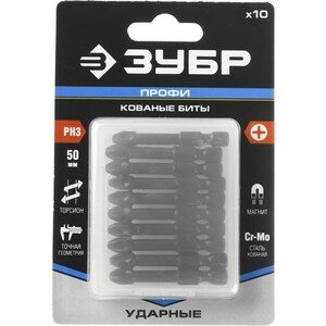 | Прочие компоненты набора | Профессиональные кованые ударные кованые биты ЗУБР - надежные комплектующие для ударных шуруповертов предназначены для монтажа и демонтажа резьбовых соединений., , Типоразмер: PH3, Тип хвостовика: E, Размер хвостовика |