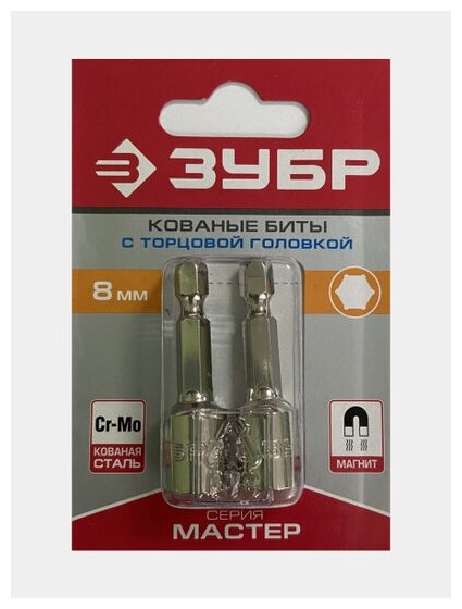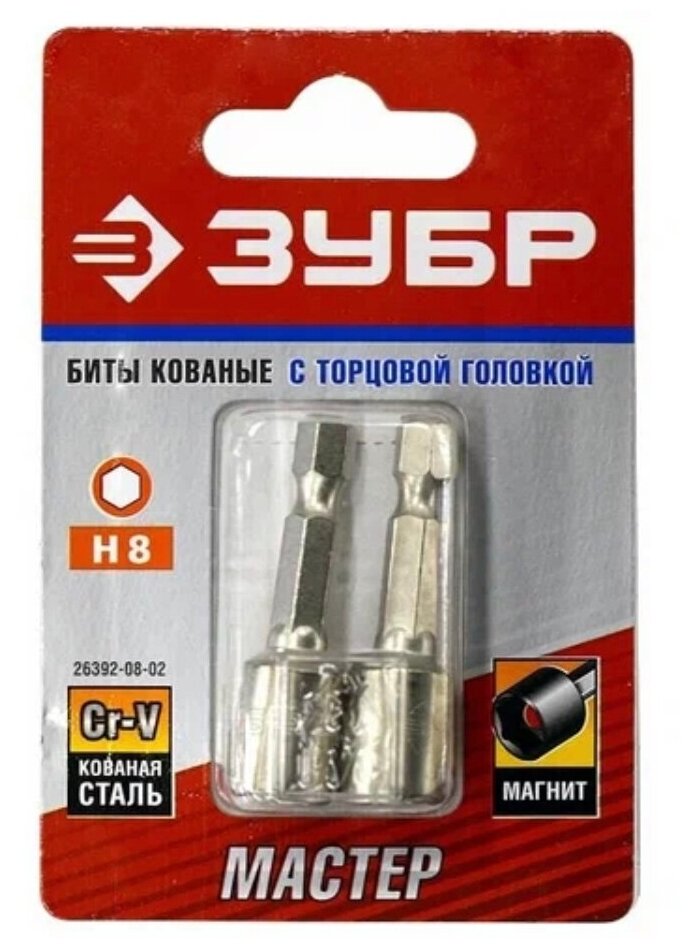 Биты Зубр с торцовой головкой, магнитные, Cr-V, тип хвостовика E 1/4, 8х45мм, 2шт