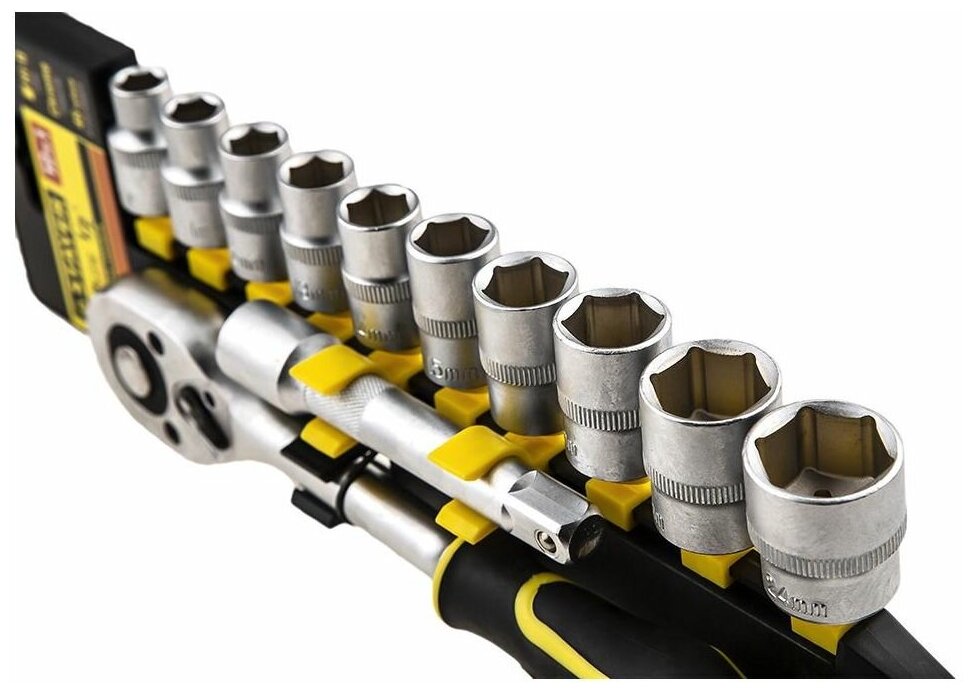 | Комплектация | головки торцовые flank 10 шт. 10, 11, 12, 13, 14, 15, 17, 19, 22, 24 мм, трещотка с быстрым сбросом 45 зубцов, удлинитель 125 мм |