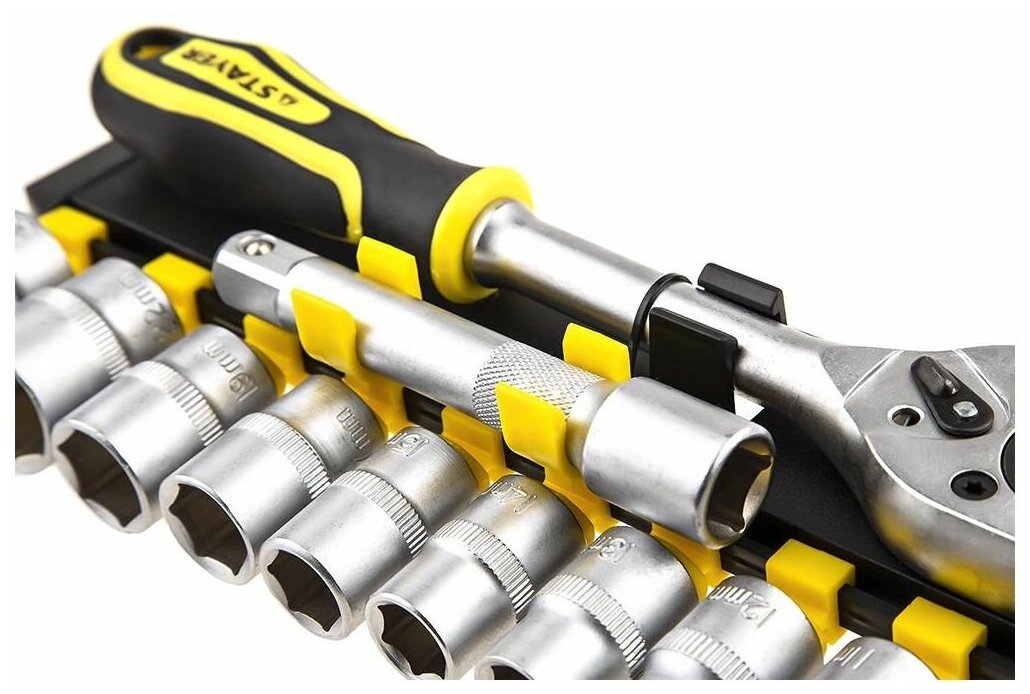 Торцовые головки STAYER STANDARD изготовлены из инструментальной стали, закалены, сочетают в себе оптимальный баланс прочности и твердости. Очень удобны в использовании и доступны по цене. Эргономичная 2-компонентная пластиковая рукоятка Трещотка с Сr-V трещоточным механизмом и быстрым сбросом Торцовые головки сделаны из инструментальной стали. Закалены для придания высокой прочности и твердости.