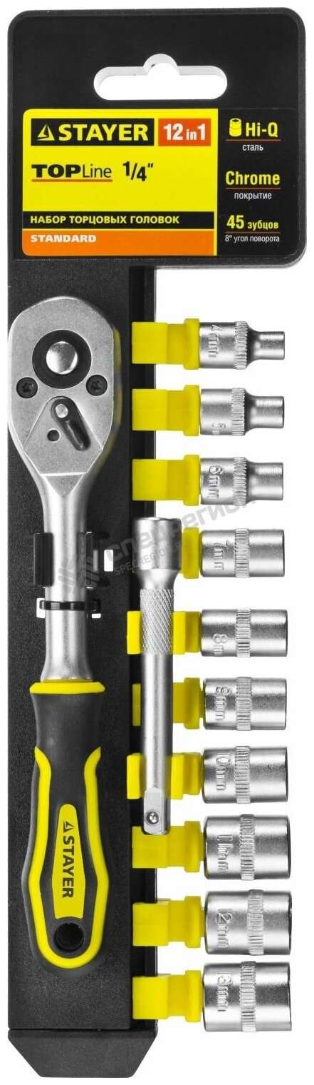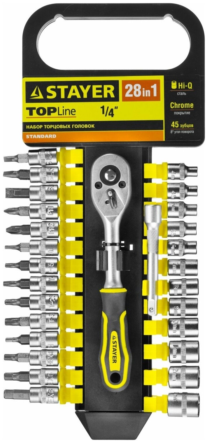 Функциональный набор торцовых головок из закаленной инструментальной стали с хромированным покрытием для монтажа и демонтажа крепежа с внешним шестигранным профилем, а также саморезов, винтов и шурупов с различным типом и размером шлица. Наборы торцовых головок STAYER TOPLine изготовлены из качественной стали, универсальны в использовании и доступны по цене. Торцовые головки и головки-биты изготовлены из закаленной инструментальной стали и обладают оптимальным балансом прочности и твердости.