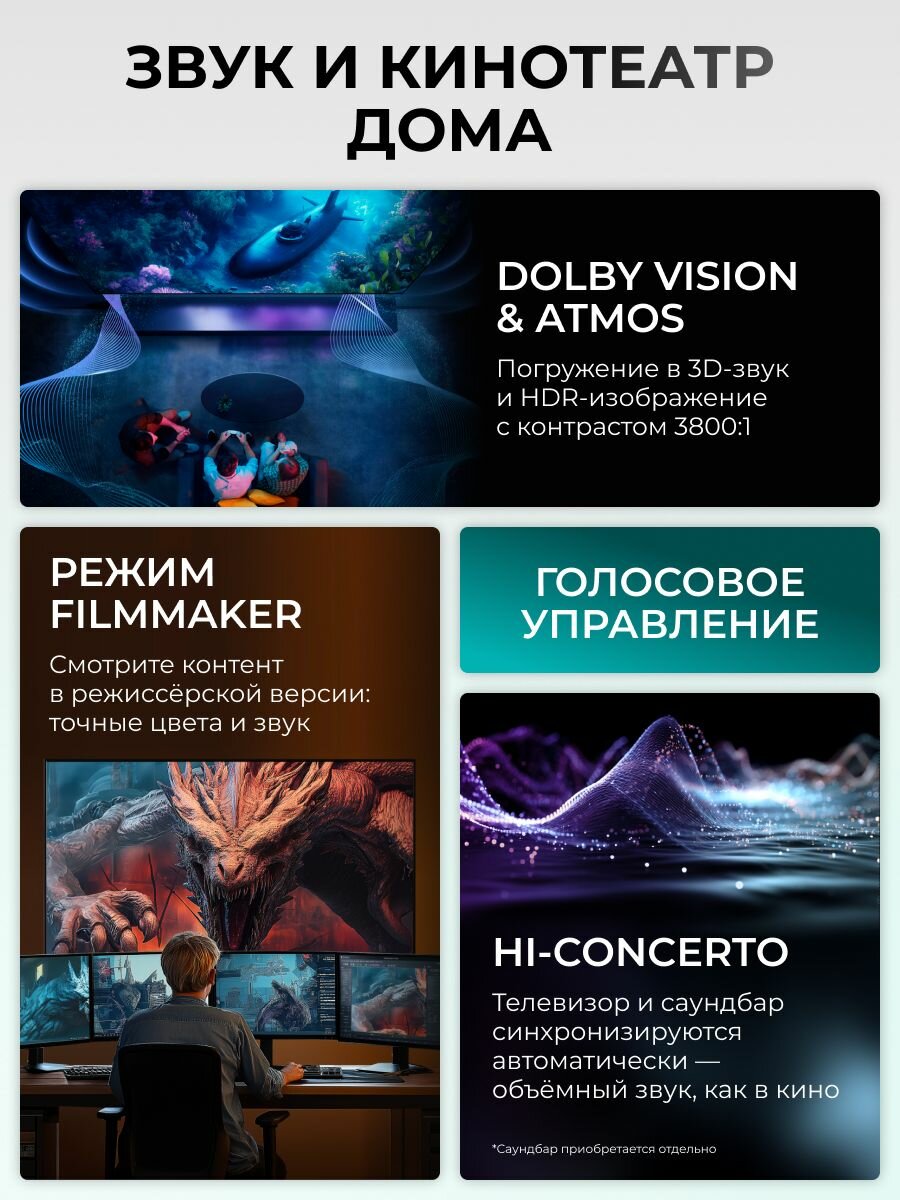 Технология Mini-LED повышает качество просмотра, обеспечивая потрясающую яркость и глубокие насыщенные тени при фантастической четкости.Экспертная обработка каждого кадра при помощи ИИ