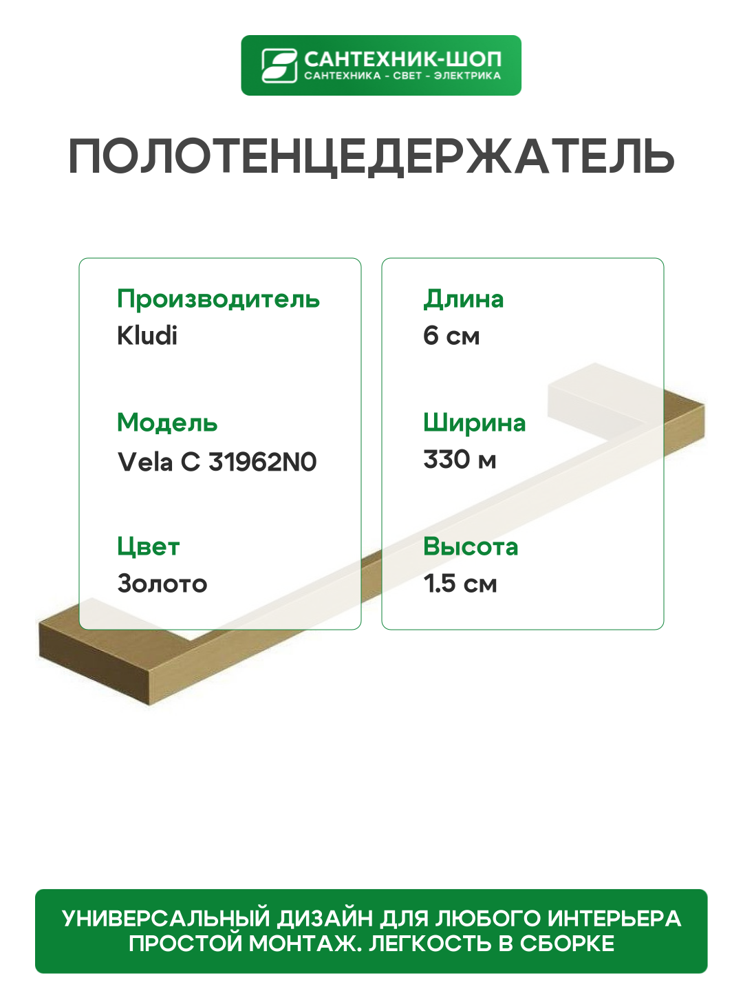 Производитель Kludi в своей продукции использует идеальное, сочетание материалов (латунь) высокого качества, с абсолютным отсутствием вредных для здоровья веществ. Золото, основной цвет исполнения Kludi Vela C, безупречно впишется в любой дизайн проект. Важные габариты изделия: ширина 33 см, глубина 6 см, высота 1.5 см. Прямоугольная форма 31962N0 прослеживается во всех линиях и придает аксессуару неповторимый стиль. Полотенцедержатель размещается в максимально удобном положении на стене благодаря подвесному способу установки.