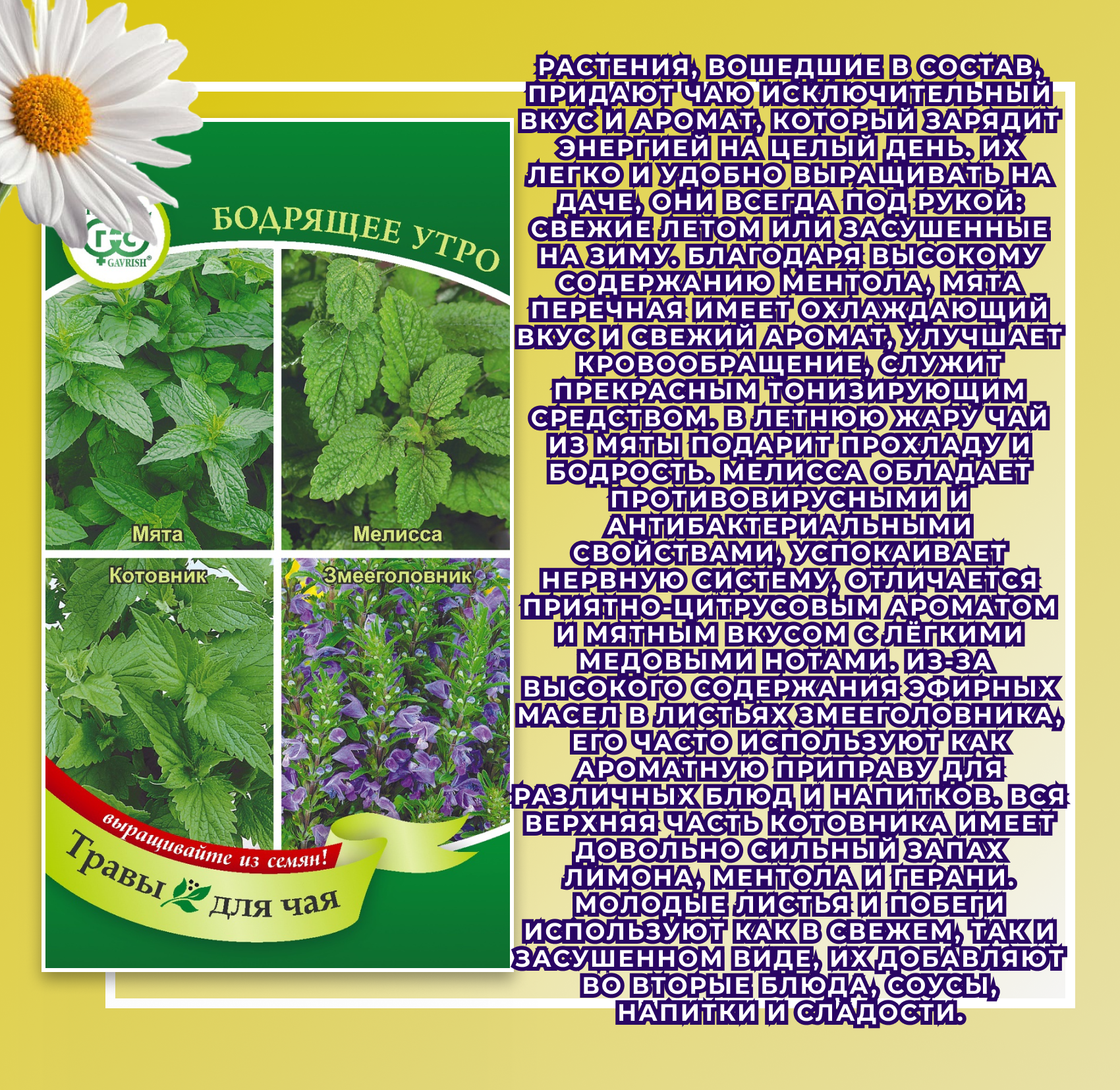 Травы для чая Бодрящее утро 0,3 г Н16 Гавриш. Многолетнее, холодостойкое растение, высотой до 1м. Обладает сильным пряным ароматом и слегка горьковатым вкусом. Используется в кулинарии в качестве приправы к салатам, мясу, при консервировании и засолки овощей, для различных ароматных напитков, лимонадов, чая. Посев на рассаду проводят ранней весной. В мае высаживают в плодородную почву по схеме 30х70 см. В течение вегетации уход состоит из рыхления междурядий, своевременных прополок и поливов. Зелень можно собирать на второй год. Срезают молодую зелень на высоте 8-10 см и сушат в тени. В течение сезона проводят не менее 2-3 срезок. Растения, вошедшие в состав, придают чаю исключительный вкус и аромат, который зарядит энергией на целый день. Их легко и удобно выращивать на даче, они всегда под рукой: свежие летом или засушенные на зиму. Благодаря высокому содержанию ментола, мята перечная имеет охлаждающий вкус и свежий аромат, улучшает кровообращение, служит прекрасным тонизирующим средством. В летнюю жару чай из мяты подарит прохладу и бодрость. Мелисса обладает противовирусными и антибактериальными свойствами, успокаивает нервную систему, отличается приятно-цитрусовым ароматом и мятным вкусом с лёгкими медовыми нотами. Из-за высокого содержания эфирных масел в листьях змееголовника, его часто используют как ароматную приправу для различных блюд и напитков. Вся верхняя часть котовника имеет довольно сильный запах лимона, ментола и герани. Молодые листья и побеги используют как в свежем, так и засушенном виде, их добавляют во вторые блюда, соусы, напитки и сладости.