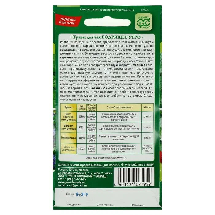 Сервис сравнения цен СкидкаГИД предлагает сравнить цены на товар «Семена Гавриш Травы для чая Бодрящее утро 03 г»