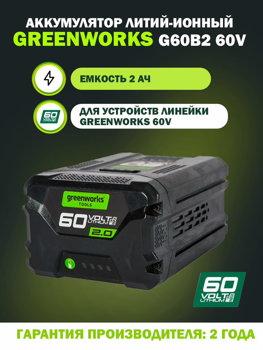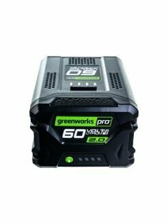 Аккумулятор Greenworks 60 вольт (модель G60B2) - новинка 2017 года. Это самый современный литий-ионный (Li-ion) аккумулятор, применяемый в линейки всех устройств Гринворкс 60 вольт.