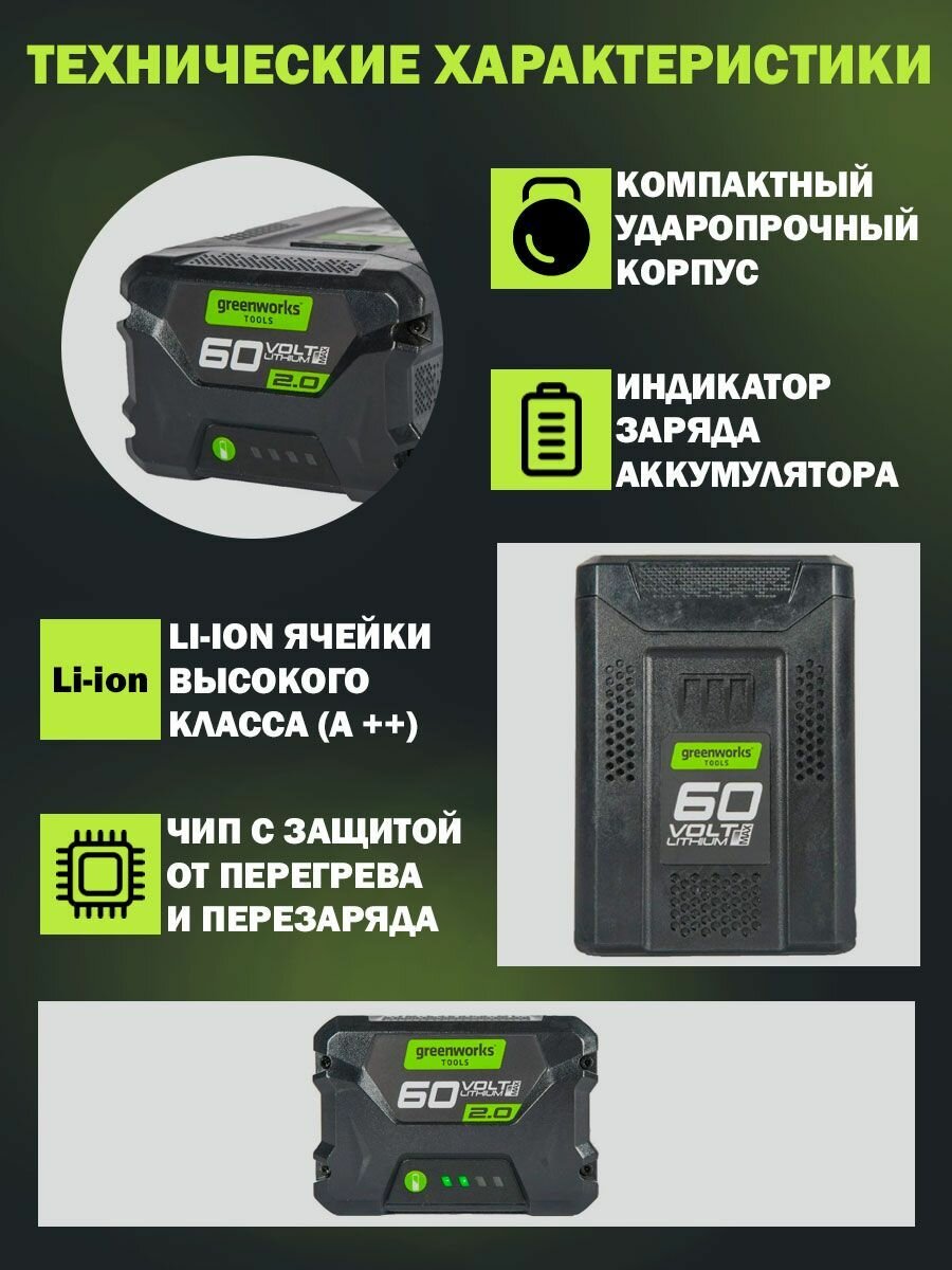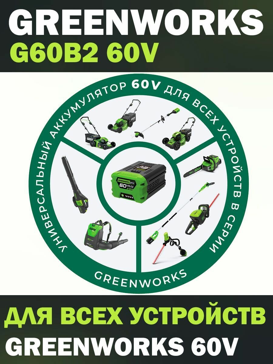 | Особенности | Совместим со всей линейкой инструмента и садовой техники Greenworks 60V PRO |