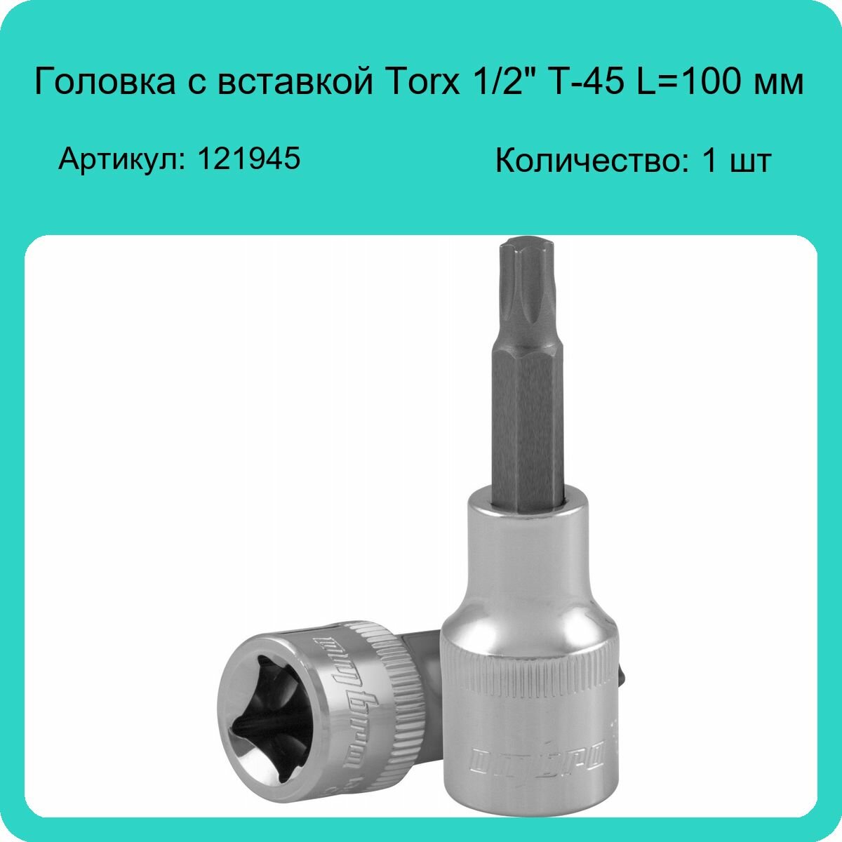 Насадка торцевая с вставкой-битой OMBRA 1/2" DR, Т45, 100 мм. Приспособление используется для откручивания различного крепежа, к которому относятся гайки, болты и т. д. Оснастка просто незаменима в случаях, когда крепеж расположен в труднодосягаемом месте, где работа с гаечными ключами не удобна. Торцевые головки подходят для ударных нагрузок и обладают лучшим крутящим моментом по отношению к резьбе, чем другой подобный инструмент. Материал оснастки хром-ванадиевая сталь, что обеспечивает ее высокую прочность и стойкость к нагрузкам и механическим воздействиям. Еще одной особенностью торцевой головки является хромоникелевое покрытие, за счет которого с поверхности оснастки легко удаляются все видимые загрязнения и она не подвергается коррозии.